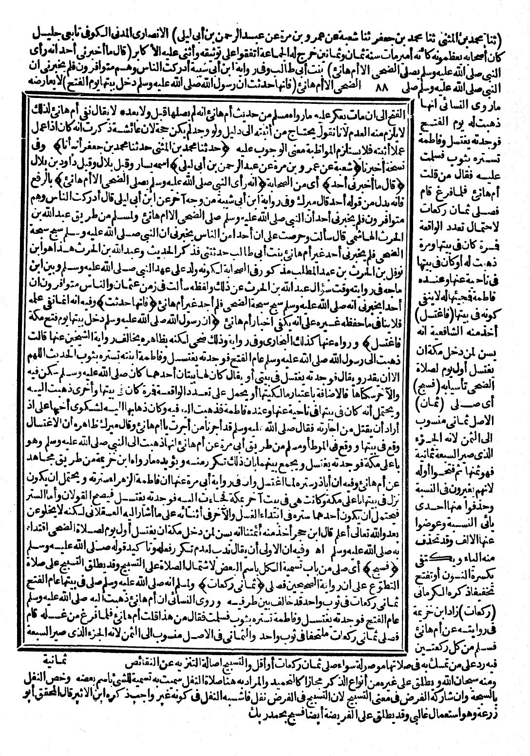 (حَدَّثَنَا مُحَمَّدُ بْنُ الْمُثَنَّى، حَدَّثَنَا مُحَمَّدُ بْنُ جَعْفَرٍ، أَنْبَأَنَا) وَفِي نُسْخَةٍ أَخْبَرَنَا (شُعْبَةُ بْنُ عَمْرِو بْنِ مُرَّةَ، عَنْ عَبْدِ الرَّحْمَنِ بْنِ أَبِي لَيْلَى) اسْمُهُ، وَقِيلَ: بِلَالٌ، وَقِيلَ: دَاوُدُ بْنُ بِلَالٍ (قَالَ: مَا أَخْبَرَنِي أَحَدٌ) أَيْ: مِنَ الصَّحَابَةِ (أَنَّهُ رَأَى النَّبِيَّ - صَلَّى اللَّهُ عَلَيْهِ وَسَلَّمَ - يُصَلِّي الضُّحَى إِلَّا أُمُّ هَانِئٍ) بِالرَّفْعِ؛ فَإِنَّهُ بَدَلٌ مِنْ قَوْلِهِ أَحَدٌ قَالَ مِيرَكُ: وَفِي رِوَايَةِ ابْنِ شَيْبَةَ مِنْ وَجْهٍ آخَرَ عَنِ ابْنِ أَبِي لَيْلَى قَالَ: أَدْرَكْتُ النَّاسَ، وَهُمْ مُتَوَافِرُونَ، فَلَمْ يُخْبِرْنِي أَحَدٌ أَنَّ النَّبِيَّ - صَلَّى اللَّهُ عَلَيْهِ وَسَلَّمَ - صَلَّى الضُّحَى إِلَّا أُمُّ هَانِئٍ، وَلِمُسْلِمٍ مِنْ طَرِيقِ عَبْدِ اللَّهِ بْنِ الْحَارِثِ الْهَاشِمِيِّ قَالَ: سَأَلْتُ وَحَرَصْتُ عَلَى أَنَّ أَحَدًا مِنَ النَّاسِ يُخْبِرُنِي أَنَّ النَّبِيَّ - صَلَّى اللَّهُ عَلَيْهِ وَسَلَّمَ - سَبَّحَ سُبْحَةَ الضُّحَى، فَلَمْ يُخْبِرْنِي أَحَدٌ غَيْرُ أُمِّ هَانِئٍ بِنْتِ أَبِي طَالِبٍ حَدَّثَتْنِي فَذَكَرَ الْحَدِيثَ، وَعَبْدُ اللَّهِ بْنُ الْحَارِثِ هَذَا هُوَ ابْنُ نَوْفَلِ بْنِ الْحَارِثِ بْنِ عَبْدِ الْمُطَّلِبِ مَذْكُورٌ فِي الصَّحَابَةِ لِكَوْنِهِ وُلِدَ عَلَى عَهْدِ النَّبِيِّ - صَلَّى اللَّهُ عَلَيْهِ وَسَلَّمَ - وَبَيَّنَ ابْنُ مَاجَهْ فِي رِوَايَتِهِ وَقْتَ سُؤَالِ عَبْدِ اللَّهِ بْنِ الْحَارِثِ عَنْ ذَلِكَ، وَلَفْظُهُ: سَأَلْتُ، فِي زَمَنِ عُثْمَانَ، وَالنَّاسُ مُتَوَافِرُونَ أَنَّ أَحَدًا يُخْبِرُنِي أَنَّهُ - صَلَّى اللَّهُ عَلَيْهِ وَسَلَّمَ - سَبَّحَ سُبْحَةَ الضُّحَى، فَلَمْ أَجِدْ غَيْرَ أُمِّ هَانِئٍ (فَإِنَّهَا حَدَّثَتْ) وَفِيهِ أَنَّهُ إِنَّمَا نَفَى عِلْمَهُ، فَلَا يُنَافِي مَا حَفِظَهُ غَيْرُهُ عَلَى أَنَّهُ يَكْفِي إِخْبَارُ أُمِّ هَانِئٍ (أَنَّ رَسُولَ اللَّهِ - صَلَّى اللَّهُ عَلَيْهِ وَسَلَّمَ - دَخَلَ بَيْتَهَا يَوْمَ فَتْحِ مَكَّةَ فَاغْتَسَلَ) ، وَرَوَاهُ عَنْهَا كَذَلِكَ الْبُخَارِيُّ، وَفِي رِوَايَةٍ، وَذَلِكَ ضُحًّى لَكِنَّهُ بِظَاهِرِهِ يُخَالِفُ رِوَايَةَ الشَّيْخَيْنِ عَنْهَا قَالَتْ: «ذَهَبْتُ إِلَى رَسُولِ اللَّهِ - صَلَّى اللَّهُ عَلَيْهِ وَسَلَّمَ - عَامَ الْفَتْحِ، فَوَجَدْتُهُ يَغْتَسِلُ، وَفَاطِمَةُ ابْنَتُهُ تَسْتُرُهُ بِثَوْبٍ» الْحَدِيثَ، اللَّهُمَّ إِلَّا أَنْ يُقَدَّرَ وَيُقَالَ: فَوَجَدْتُهُ يَغْتَسِلُ فِي بَيْتِي، أَوْ يُقَالُ كَانَ لَهَا بَيْتَانِ أَحَدُهُمَا كَانَ - صَلَّى اللَّهُ عَلَيْهِ وَسَلَّمَ - سَكَنُهُ فِيهِ وَالْآخَرُ سُكْنَاهَا، فَالْإِضَافَةُ بِاعْتِبَارِ مَالِكِيَّتِهَا أَوْ يُحْمَلُ عَلَى تَعَدُّدِ الْوَاقِعَةِ، فَمَرَّةً كَانَ فِي بَيْتِهَا، وَأُخْرَى ذَهَبَتْ إِلَيْهِ وَيُحْتَمَلُ أَنَّهُ كَانَ فِي بَيْتِهَا فِي نَاحِيَةٍ عَنْهَا وَعِنْدَهُ فَاطِمَةُ فَذَهَبَتْ إِلَيْهِ وَكَانَ ذَهَابُهَا إِلَيْهِ لِشَكْوَى أَخِيهَا عَلِيٍّ إِذْ أَرَادَ أَنْ يَقْتُلَ مَنْ أَجَارَتْهُ فَقَالَ - صَلَّى اللَّهُ عَلَيْهِ وَسَلَّمَ - قَدْ أَجَرْنَا مَنْ أَجَرْتِ يَا أُمَّ هَانِئٍ، وَقَالَ مِيرَكُ: ظَاهِرُهُ أَنَّ الِاغْتِسَالَ وَقَعَ فِي بَيْتِهَا. وَوَقَعَ فِي الْمُوَطَّأِ وَمُسْلِمٍ مِنْ طَرِيقِ أَبِي مُرَّةَ عَنْ أُمِّ هَانِئٍ أَنَّهَا ذَهَبَتْ إِلَى النَّبِيِّ - صَلَّى اللَّهُ عَلَيْهِ وَسَلَّمَ - وَهُوَ بِأَعْلَى مَكَّةَ فَوَجَدَتْهُ يَغْتَسِلُ، وَيُجْمَعُ بَيْنَهُمَا بِأَنَّ ذَلِكَ تَكْرَارٌ مِنْهُ، وَيُؤَيِّدُهُ مَا رَوَاهُ ابْنُ خُزَيْمَةَ مِنْ طَرِيقِ مُجَاهِدٍ عَنْ أُمِّ هَانِئٍ، وَفِيهِ أ