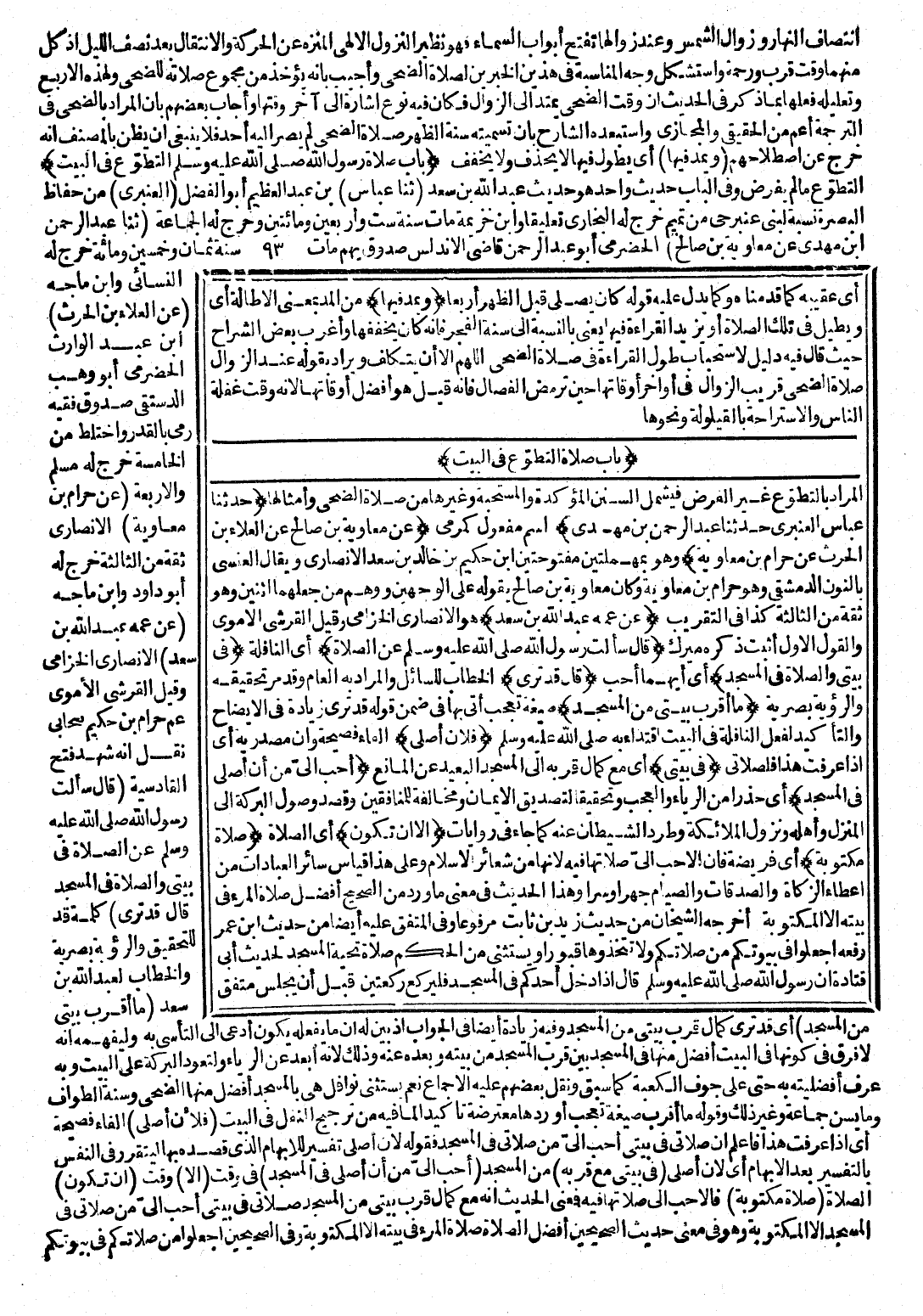 (عَنْ مُعَاوِيَةَ بْنِ صَالِحٍ عَنِ الْعَلَاءِ بْنِ الْحَارِثِ عَنْ حَرَامِ بْنِ مُعَاوِيَةَ) وَهُوَ بِمُهْمَلَتَيْنِ مَفْتُوحَتَيْنِ ابْنِ حَكِيمِ بْنِ خَالِدِ بْنِ سَعْدٍ الْأَنْصَارِيِّ، وَيُقَالُ الْعَنْسِيُّ بِالنُّونِ الدِّمَشْقِيُّ، وَهُوَ حَرَامُ بْنُ مُعَاوِيَةَ، وَكَانَ مُعَاوِيَةُ بْنُ صَالِحٍ يَقُولُهُ عَلَى الْوَجْهَيْنِ، وَوَهِمَ مَنْ جَعَلَهُمَا اثْنَيْنِ وَهُوَ ثِقَةٌ مِنَ الثَّالِثَةِ كَذَا فِي التَّقْرِيبِ (عَنْ عَمِّهِ عَبْدِ اللَّهِ بْنِ سَعْدٍ) هُوَ الْأَنْصَارِيُّ الْحَرَمِيُّ، وَقِيلَ الْقُرَيْشِيُّ الْأُمَوِيُّ وَالْقَوْلُ الْأَوَّلُ أَثْبَتُ ذَكَرَهُ مِيرَكُ (قَالَ: سَأَلْتُ رَسُولَ اللَّهِ - صَلَّى اللَّهُ عَلَيْهِ وَسَلَّمَ - عَنِ الصَّلَاةِ) أَيِ: النَّافِلَةِ (فِي بَيْتِي وَالصَّلَاةِ فِي الْمَسْجِدِ) أَيْ: أَيُّهُمَا أَحَبُّ (قَالَ قَدْ تَرَى) الْخِطَابَ لِلسَّائِلِ، وَالْمُرَادُ بِهِ الْعَامُّ، وَقَدْ مَرَّ تَحْقِيقُهُ وَالرُّؤْيَةُ بَصَرِيَّةٌ (مَا أَقْرَبَ بَيْتِيَ مِنَ الْمَسْجِدِ) صِيغَةُ تَعَجُّبٍ أَتَى بِهَا فِي ضِمْنِ قَوْلِهِ قَدْ تَرَى زِيَادَةً فِي الْإِيضَاحِ وَالتَّأْكِيدِ لِفِعْلِ النَّافِلَةِ فِي الْبَيْتِ اقْتِدَاءً بِهِ - صَلَّى اللَّهُ عَلَيْهِ وَسَلَّمَ - (فَلَأَنْ أُصَلِيَ) الْفَاءُ: فَصِيحَةٌ، وَأَنْ: مَصْدَرِيَّةٌ أَيْ: إِذَا عَرَفْتَ هَذَا فَلِصَلَاتِي (فِي بَيْتِي) أَيْ: مَعَ كَمَالِ قُرْبِهِ إِلَى الْمَسْجِدِ الْبَعِيدِ عَنِ الْمَانِعِ (أَحَبُّ إِلَيَّ مِنْ أَنْ أُصَلِيَ فِي الْمَسْجِدِ) أَيْ: حَذَرًا مِنَ الرِّيَاءِ وَالْعَجَبِ، وَتَحْقِيقًا لِتَصْدِيقِ الْإِيمَانِ، وَمُخَالَفَةً لِلْمُنَافِقِينَ، وَقَصْدَ وَصُولِ الْبَرَكَةِ إِلَى الْمَنْزِلِ، وَأَهْلِهِ وَنُزُولِ الْمَلَائِكَةِ، وَطَرْدِ الشَّيْطَانِ عَنْهُ كَمَا جَاءَ فِي رِوَايَاتٍ (إِلَّا أَنْ تَكُونَ) أَيِ: الصَّلَاةُ (صَلَاةً مَكْتُوبَةً) أَيْ: فَرِيضَةً ; فَإِنَّ الْأَحَبَّ إِلَيَّ صَلَاتُهَا فِيهِ ; لِأَنَّهَا مِنْ شَعَائِرِ الْإِسْلَامِ، وَعَلَى هَذَا قِيَاسُ سَائِرِ الْعِبَادَاتِ مِنْ إِعْطَاءِ الزَّكَاةِ وَالصَّدَقَاتِ وَالصِّيَامِ جَهْرًا وَسِرًّا، وَهَذَا الْحَدِيثُ فِي مَعْنَى مَا وَرَدَ مِنَ الصَّحِيحِ أَفْضَلُ الصَّلَاةِ صَلَاةُ الْمَرْءِ فِي بَيْتِهِ إِلَّا الْمَكْتُوبَةَ أَخْرَجَهُ الشَّيْخَانِ مِنْ حَدِيثِ زَيْدِ بْنِ ثَابِتٍ مَرْفُوعًا، وَفِي الْمُتَّفَقِ عَلَيْهِ أَيْضًا مِنْ حَدِيثِ ابْنِ عُمَرَ رَفَعَهُ.