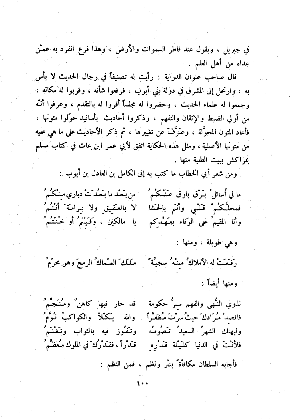 فلأنت في الدنيا كليلة قدره ... قدراً، فقدرك في الملوك معظّم فأجابه السلطان مكافأةً بنثر ونظم، فمن النظم: