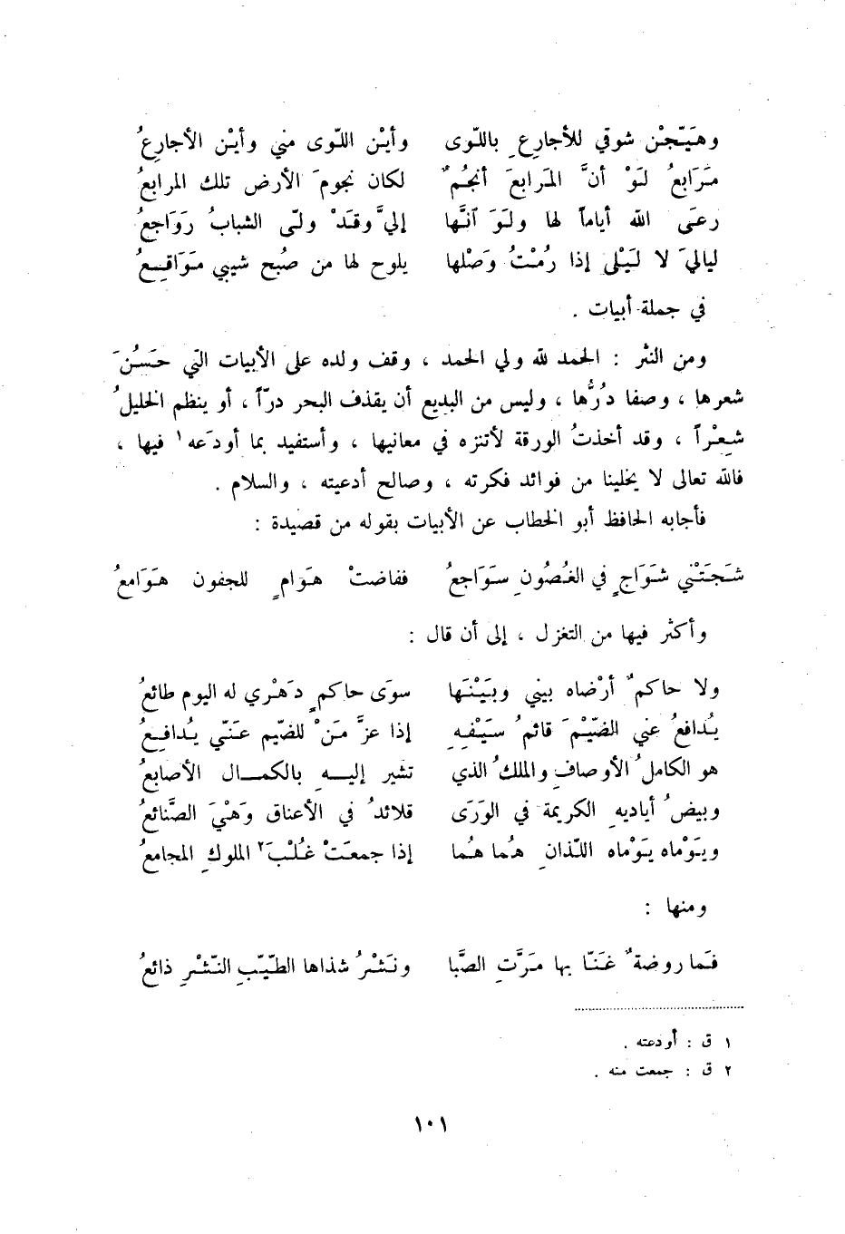 شجتني شواجٍ في الغصون سواجع ... ففاضت هوامٍ للحفون هوامع وأكثر فيها من التغزل، إلى أن قال: