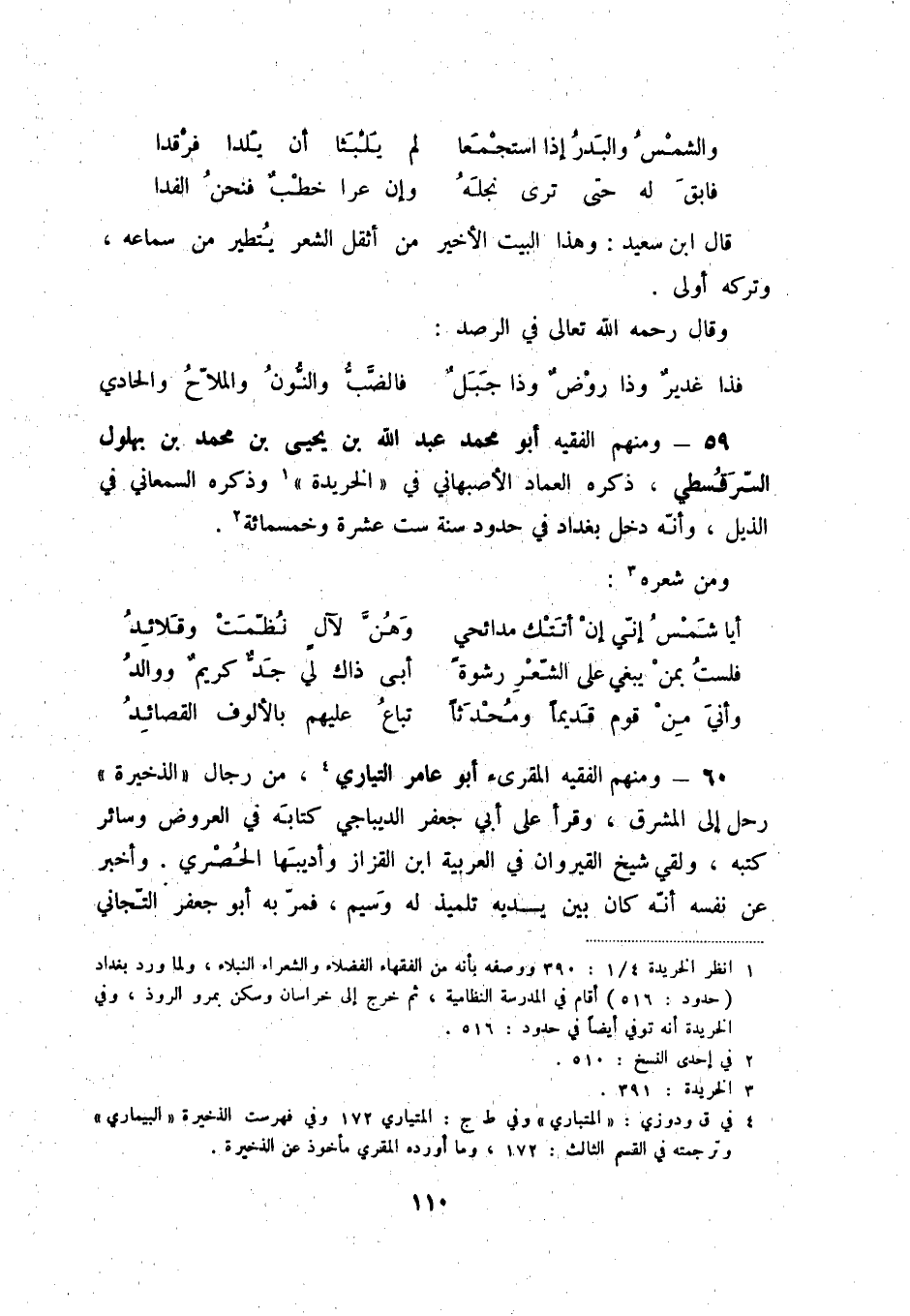 فذا غديرٌ وذا روضٌ وذا جبلٌ ... فالضّبّ والنّون والملاّح والحادي 59 - ومنهم الفقيه أبو محمد عبد الله بن يحيى بن محمد بن بهلول السّرقسطي، ذكره العماد الأصبهاني في " الخريدة " (1) وذكره السمعاني في الذيل، وأنّه دخل بغداد في حدود سنة ست عشرة وخمسمائة (2) .