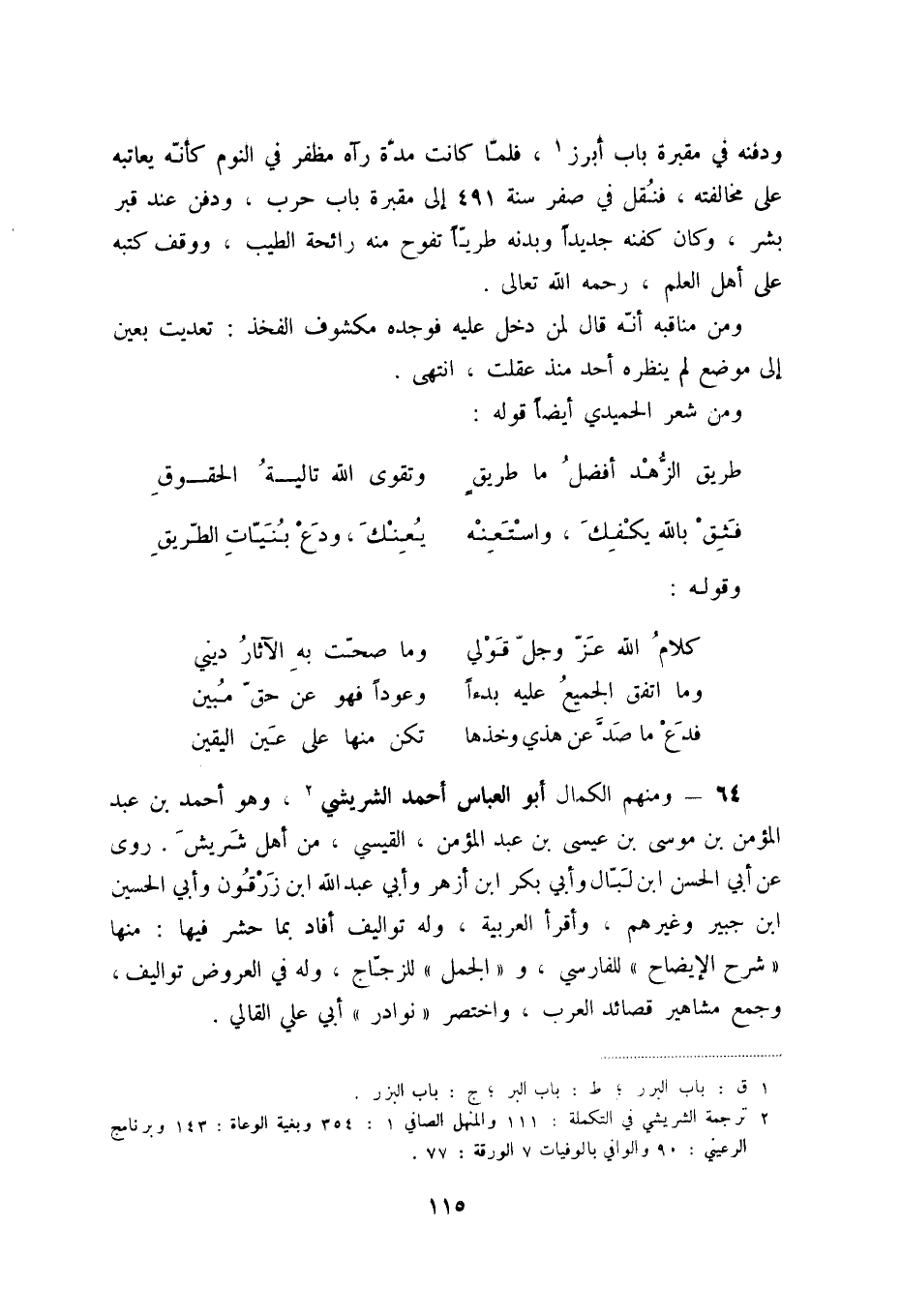 فدع ما صدّ عن هذي وخذها ... تكن منها على عين اليقين 64 - ومنهم الكمال أبو العباس أحمد الشريشي (2) ، وهو أحمد بن عبد المؤمن ين موسى بن عيسى بن عبد المؤمن، القيسي، من أهل شريش. روى عن أبي الحسن ابن لبّال وأبي بكر ابن أزهر وأبي عبد الله ابن زرقون وأبي الحسين ابن جبير وغيرهم، وأقرأ العربية، وله تواليف أفاد بما حشر فيها: منها شرح الإيضاح للفارسي، والجمل للزجّاج، وله في العروض تواليف، وجمع مشاهير قصائد العرب، واختصر نوادر أبي علي القالي.