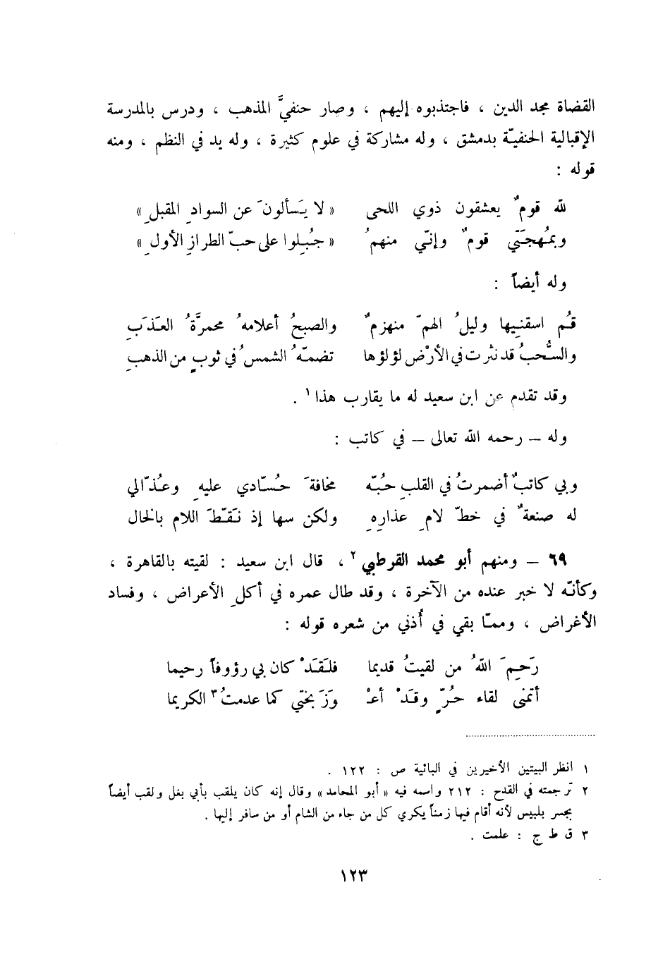 له صنعةٌ في خطّ لام عذاره ... ولكن سها إذ نقّط اللام بالخال 69 - ومنهم أبو محمد القرطبي (2) ، قال ابن سعيد: لقيته بالقاهرة، وكأنّه لا خبر عنده من الآخرة، وقد طال عمره في أكل الأعراض، وفساد الأغراض، وممّا بقي في أذني من شعره قوله: