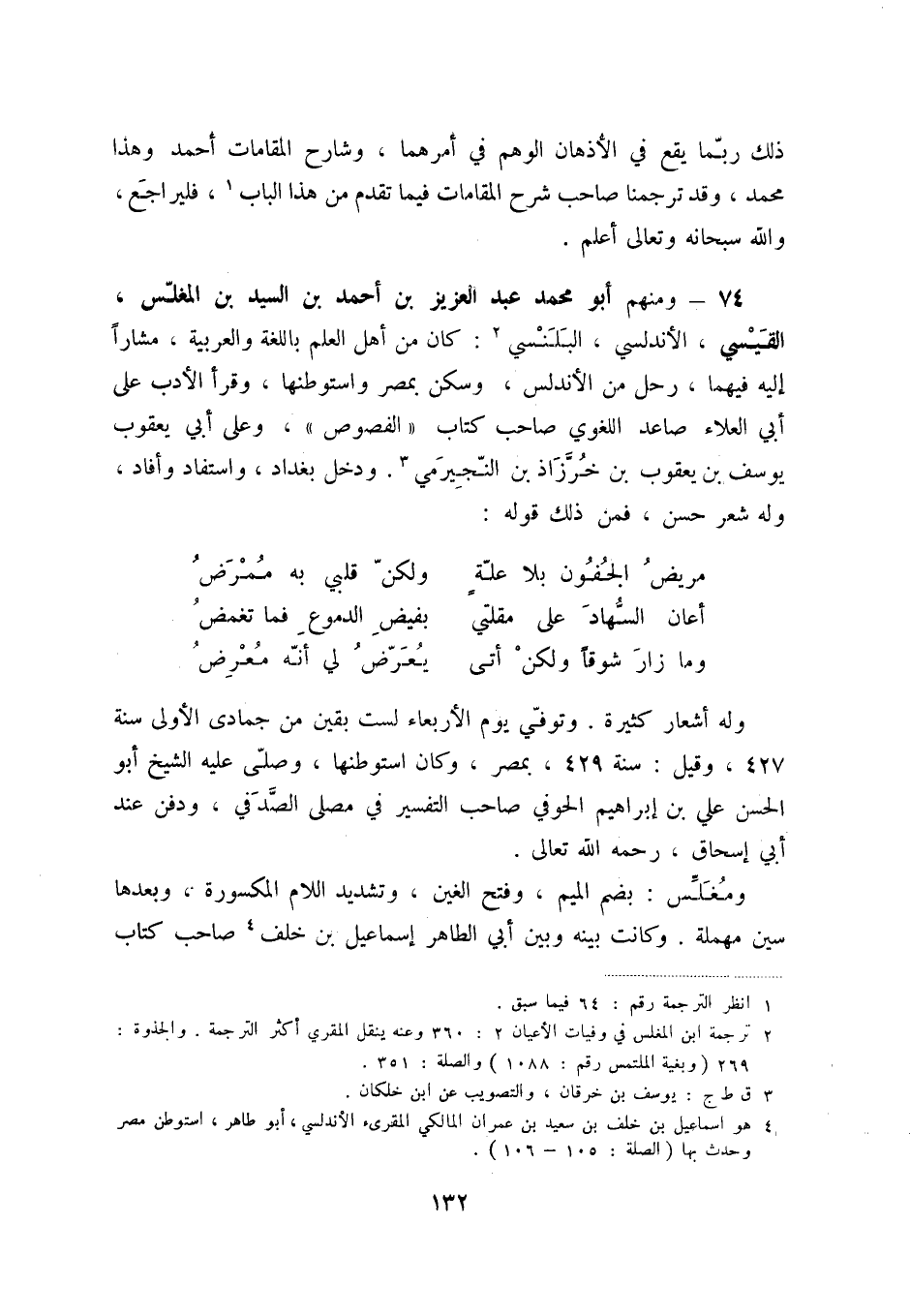 74 - ومنهم أبو محمد عبد العزيز بن أحمد بن السيد بن الغلّس، القيسي، الأندلسي، البلنسي (2) : كان من أهل العلم باللغة والعربية، مشاراً إليه فيهما، رحل من الأندلس، وسكن بمصر واستوطنها، وقرأ الأدب على أبي العلاء صاعد اللغوي صاحب كتاب " الفصوص "، وعلى أبي يعقوب يوسف بن يعقوب بن خرّزاذ بن النّجيرمي (3) . ودخل بغداد، واستفاد وأفاد، وله شعر حسن، فمن ذلك قوله: