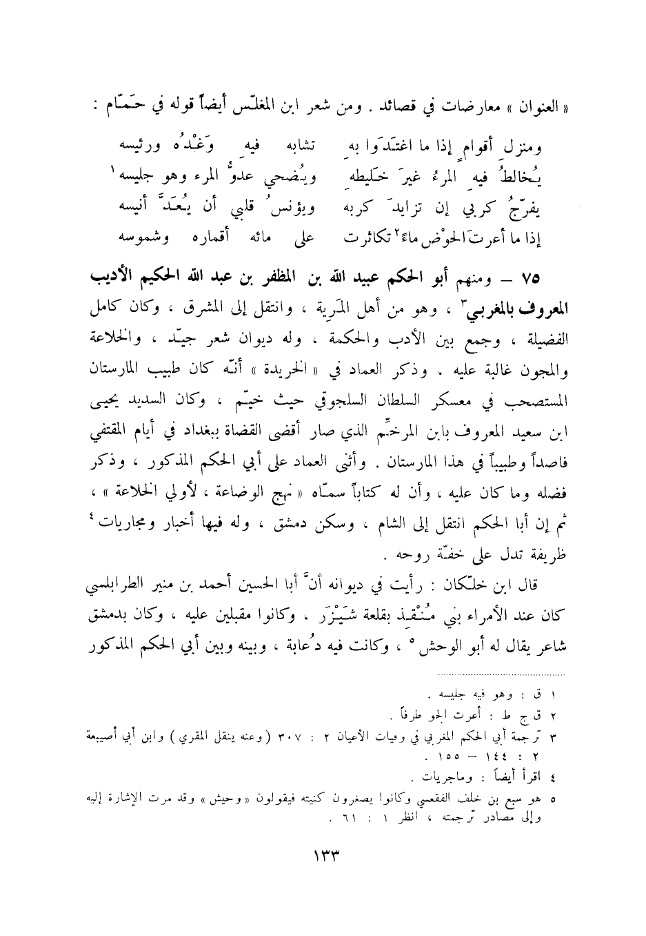 إذا ما أعرت الحوض ماءً (2) تكاثرت ... على مائه أقماره وشموسه 75 - ومنهم أبو الحكم عبيد الله بن المظفر بن عبد الله الحكيم الأديب المعروف بالمغربي (3) ، وهو من أهل المرية، وانتقل إلى المشرق، وكان كامل الفضيلة، وجمع بين الأدب والحكمة، وله ديوان شعر جيّد، والخلاعة والمجون غالبة عليه، وذكر العماد في الخريدة أنّه كان طبيب المارستان الستصحب في معسكر السلطان السلجوقي حيث خيّم، وكان السديد يحيى ابن سعيد المعروف بابن المرخّم الذي صار أقضى القضاة ببغداد في أيام المقتفي فاصداً وطبيباً في هذا المارستان. وأثنى العماد على أبي الحكم المذكور، وذكر فضله وما كان عليه، وأن له كتاباً سمّاه نهج الوضاعة، لأولي الخلاعة، ثم إن أبا الحكم انتقل إلى الشام، وسكن دمشق، وله فيها أخبار ومجاريات (4) ظريفة تدل على خفّة روحه.