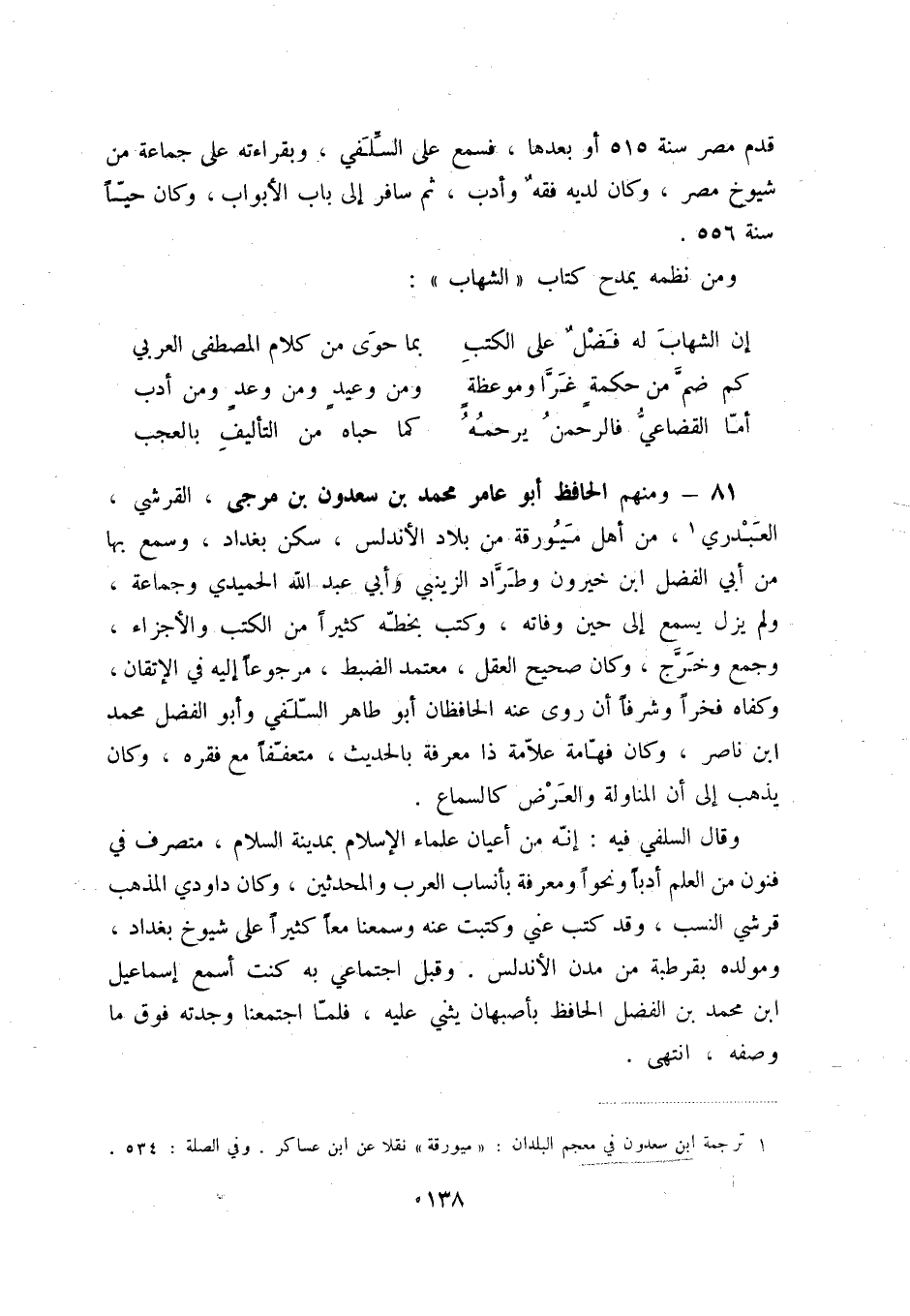 أمّا القضاعيّ فالرحمن يرحمه ... كما حباه من التأليف بالعجب 81 - ومنهم الحافظ أبو عامر محمد بن سعدون بن مرجى، القرشي، العبدري (1) ، من أهل ميورقة من بلاد الأندلس، سكن بغداد، وسمع بها من أبي الفضل ابن خيرون وطرّاد الزينبي وأبي عبد الله الحميدي وجماعة، ولم يزل يسمع إلى حين وفاته، وكتب بخطّه كثيراً من الكتب والأجزاء، وجم وخرّج، وكان صحيح العقل، معتمد الضبط، مرجوعاً إليه في الإتقان، وكفاه فخراً وشرفاً أن روى عنه الحافظان أبو طاهر السّلفي وأبو الفضل محمد ابن ناصر، وكان فهّامة علاّمة ذا معرفة بالحديث، متعفّفاً مع فقره، وكان يذهب إلى أن المناولة والعرض كالسماع.
