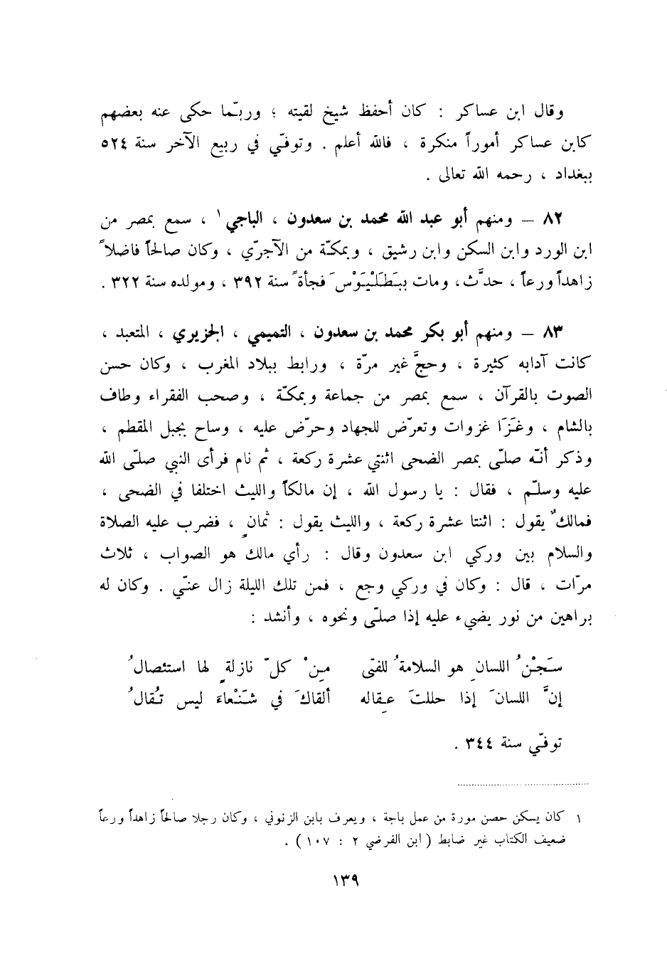 82 - ومنهم أبو عبد الله محمد بن سعدون، الباجي (1) ، سمع بمصر من ابن الورد وابن السكن وابن رشيق، وبمكّة من الآجرّي، وكان صالحاً فاضلاً زاهداً ورعاً، حدّث، ومات ببطليوس وفجأة سنة 392، ومولده سنة 322.