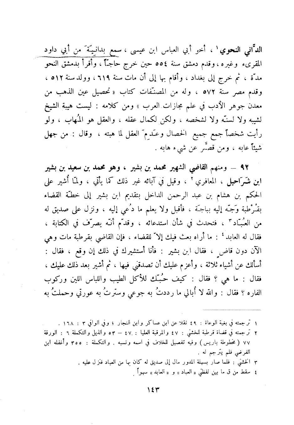 (2) ترجمته في قضاة قرطبة للخشني: 47 والمرقبة العليا: 47 - 53 والذيل والتكملة 6: الورقة 77 (مخطوطة باريس) وفيه تفصيل للخلاف في اسمه ونسبه. والتكملة: 355 وأغفله ابن الفرضي فلم يترجم له.