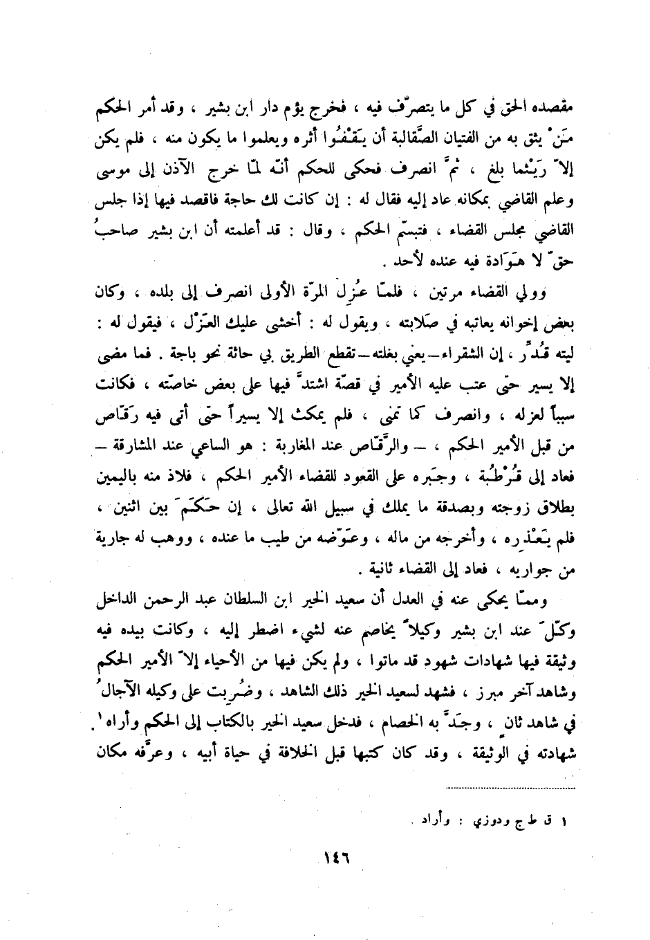 وممّا يحكى عنه في العدل أن سعيد الخير ابن السلطان عبد الرحمن الداخل وكّل عند ابن بشير وكيلاً يخاصم عنه لشيء اضطر إليه، وكانت بيده فيه وثيقة فيها شهادات شهود قد ماتوا، ولم يكن فيها من الأحياء إلاّ الأمير الحكم وشاهد آخر مبرز، فشهد لسعيد الخير ذلك الشاهد، وضربت على وكيله الآجال في شاهد ثانٍ، وجدّ به الخصام، فدخل سعيد الخير بالكتاب إلى الحكم وأراه (1) . شهادته في الوثيقة، وقد كان كتبها قبل الخلافة في حياة أبيه، وعرّفه مكان