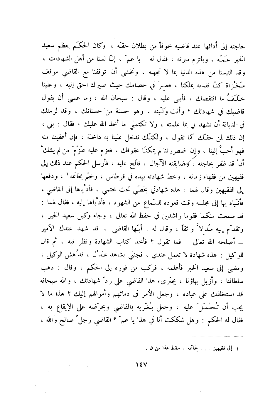 حاجته إلى أدائها عند قاضيه خوفاً من بطلان حقّه، وكان الحكم يعظم سعيد الخير عمّه، ويلتزم مبرته، فقال له: يا عمّ، إنّا لسنا من أهل الشهادات، وقد التبسنا من هذه الدنيا بما لا تجهله، ونخشى أن توقفنا مع القاضي موقف مخزاة كنّا نفديه بملكنا، فصر في خصامك حيث صيرك الحق إليه، وعلينا خلف ما انتقصك، فأبى عليه، وقال: سبحان الله، وما عسى أني قول قاضيك في شهادتك وأنت ولّيته، وهو حسنة من حسناتك، وقد لزمتك في الديانة أن تشهد لي بما علمته، ولا تكتمني ما أخذ الله عليك؛ فقال: بلى، إن ذلك لمن حقّك كما تقول، ولكنّك تدخل علينا به داخلة، فإن أعفيتنا منه فهو أحبّ إلينا، وإن اضطررتنا لم يمكنّا عقوقك، فعزم عليه عزم من لم يشكّ أن قد ظفر بحاجته، وضايقته الآجال، فألح عليه، فأرسل الحكم عند ذلك إلى فقيهين من فقهاء زمانه، وخط شهادته بيده في قرطاس، وختم بخاتمه (1) ، ودفعها إلى الفقيهين وقال لهما: هذه شهادتي بخطّي تحت ختمي، فأدّياها إلى القاضي، فأتياه بها إلى مجلسه وقت قعوده للسّماع من الشهود، فادّياها إليه، فقال لهما: قد سمعت منكما فقوما راشدين في حفظ الله تعالى، وجاء وكيل سعيد الخير، وتقدّم إليه مدلاًّ واثقاً، وقال له: أيّها القاضي، قد شهد عندك الأمير أصلحه الله تعالى فماذا تقول فأخذ كتاب الشهادة ونظر فيه، ثم قال للوكيل: هذه شهادة لا تعمل عندي فجئني بشاهد عدل، فدهش الوكيل ومضى إلى سعيد الخير فأعلمه، فركب من فوره إلى الحكم، وقال: ذهب سلطاننا، وأزيل بهاؤنا، يجترئ هذا القاضي على ردّ شهادتك، والله سبحانه قد استخلفك على عباده، وجعل الأمر في دمائهم وأموالهم وإليك هذا ما لا يجب أن تحمل عليه، وجعل يغريه بالقاضي ويحرّضه على الإيقاع به، فقال له الحكم: وهو شككت أنا في هذا يا عمّ القاضي رجلٌ صالح والله،