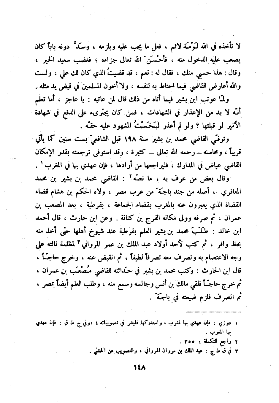 وتوفّي القاضي محمد بن بشير سنة 198 قبل الشافعيّ بست سنين كما يأتي قريباً، ومحاسنه - رحمه الله تعالى - كثيرة، وقد استوفى ترجمته بقدر الإمكان القاضي عياض في المدارك، فليراجعها من أرادها، فإن عهدي بها في المغرب (1) .