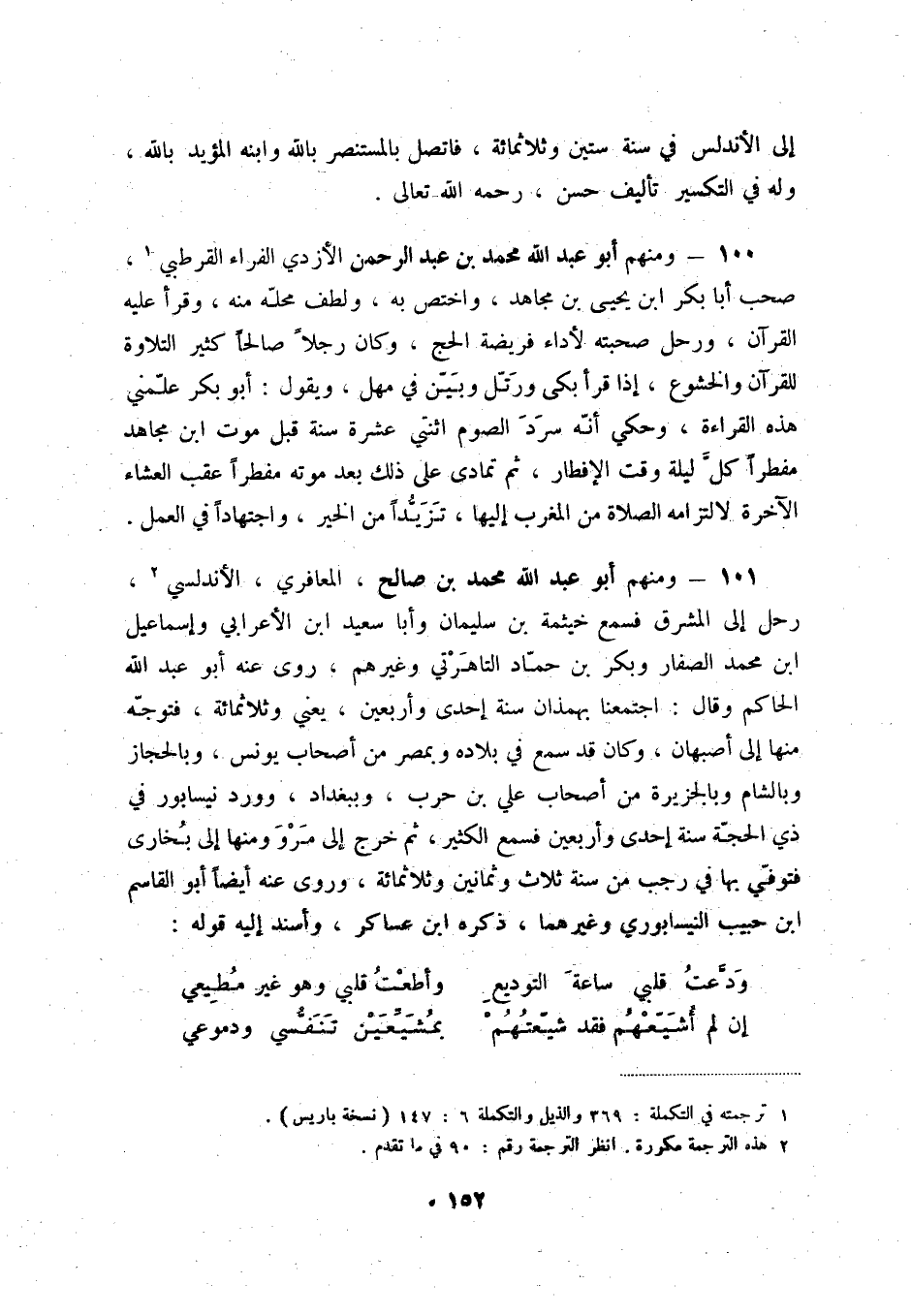 100 - ومنهم أبو عبد الله محمد بن عبد الرحمن الأزدي، الفراء القرطبي (1) ، صحب أبا بكر ابن يحيى بن مجاهد، واختص به، ولطف محلّه منه، وقرأ عليه القرآن، ورحل صحبته لأداء فريضة الحجّ، وكان رجلاً صالحاً كثير التلاوة للقرآن والخشوع، إذا قرأ بكى ورتّل وبيّن في مهل، ويقول: أبو بكر علّمني هذه القراءة، وحكي أنّه سرد الصوم اثنتي عشرة سنة قبل موت ابن مجاهد مفطراً كلّ ليلة وقت الإفطار، ثم تمادى على ذلك بعد موته مفطراً عقب العشاء الآخرة لالتزامه الصلاة من المغرب إليها، تزيّداً من الخير، واجتهاداً في العمل.