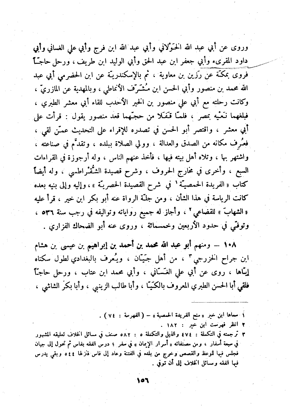 108 - ومنهم أبو عبد الله محمد بن أحمد بن إبراهيم بن عيسى بن هشام بن جراح الخزرجي (3) ، من أهل جيّان، ويعرف بالبغدادي لطول سكناه إيّاها، روى عن أبي علي الغسّاني، وأبي محمد ابن عتاب، ورحل حاجّاً فلقي أبا الحسن الطبري المعروف بالكيّا، وأبا طالب الزينبي، وأبا بكر الشاشي،