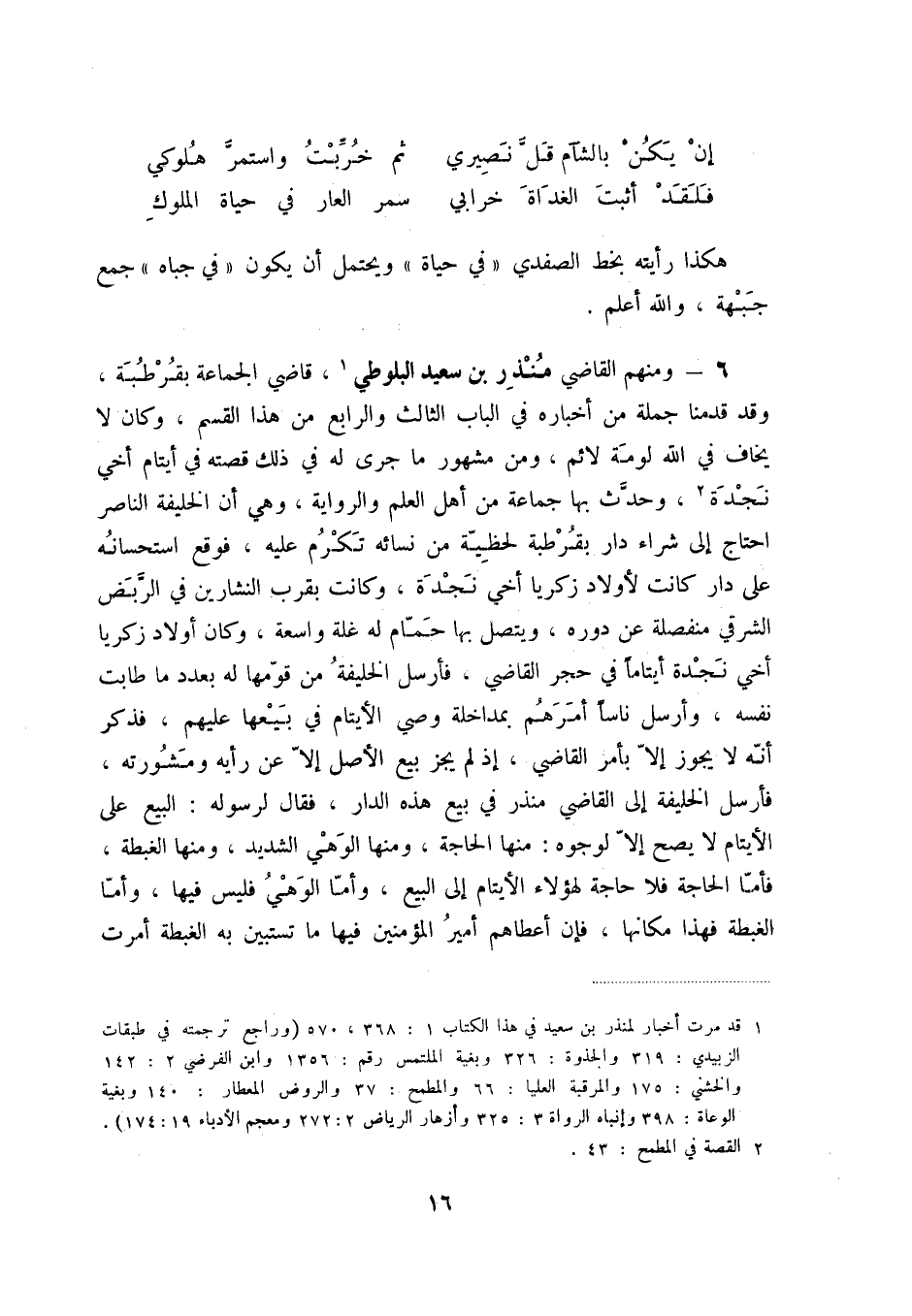 (1) قد مرت أخبار لمنذر بن سعيد في هذا الكتاب 1: 368، 570 (وراجع ترجمته في طبقات الزبيدي: 319 والجذوة: 326 وبغية الملتمس رقم: 1356 وابن الفرضي 2: 142 والخشني: 175 والمرقبة العليا: 66 والمطمح: 37 والروض المعطار: 140 وبغية الوعاة: 398 وإنباه الرواة 3: 325 وأزهار الرياض 2: 272 ومعجم الأدباء 19: 174) .
