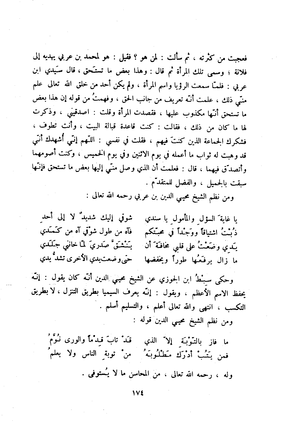ما زال يرفعها طوراً ويخفضها ... حتى وضعت يدي الأخرى تشدّ يدي وحكى سبط ابن الجوزي عن الشيخ محيي الدين أنّه كان يقول: إنّه يحفظ الاسم الأعظم، ويقول: إنّه يعرف السيميا بطريق التنزل، لا بطريق التكسب، انتهى والله تعالى أعلم، والتسليم أسلم.