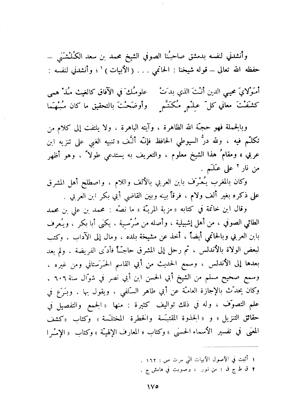 وأنشدني لنفسه بدمشق صاحبنا الصوفي الشيخ محمد بن سعد الكلشني - حفظه الله تعالى - قوله شيخنا: الحاتمي ... (الأبيات) (1) ؛ وأنشدني لنفسه: