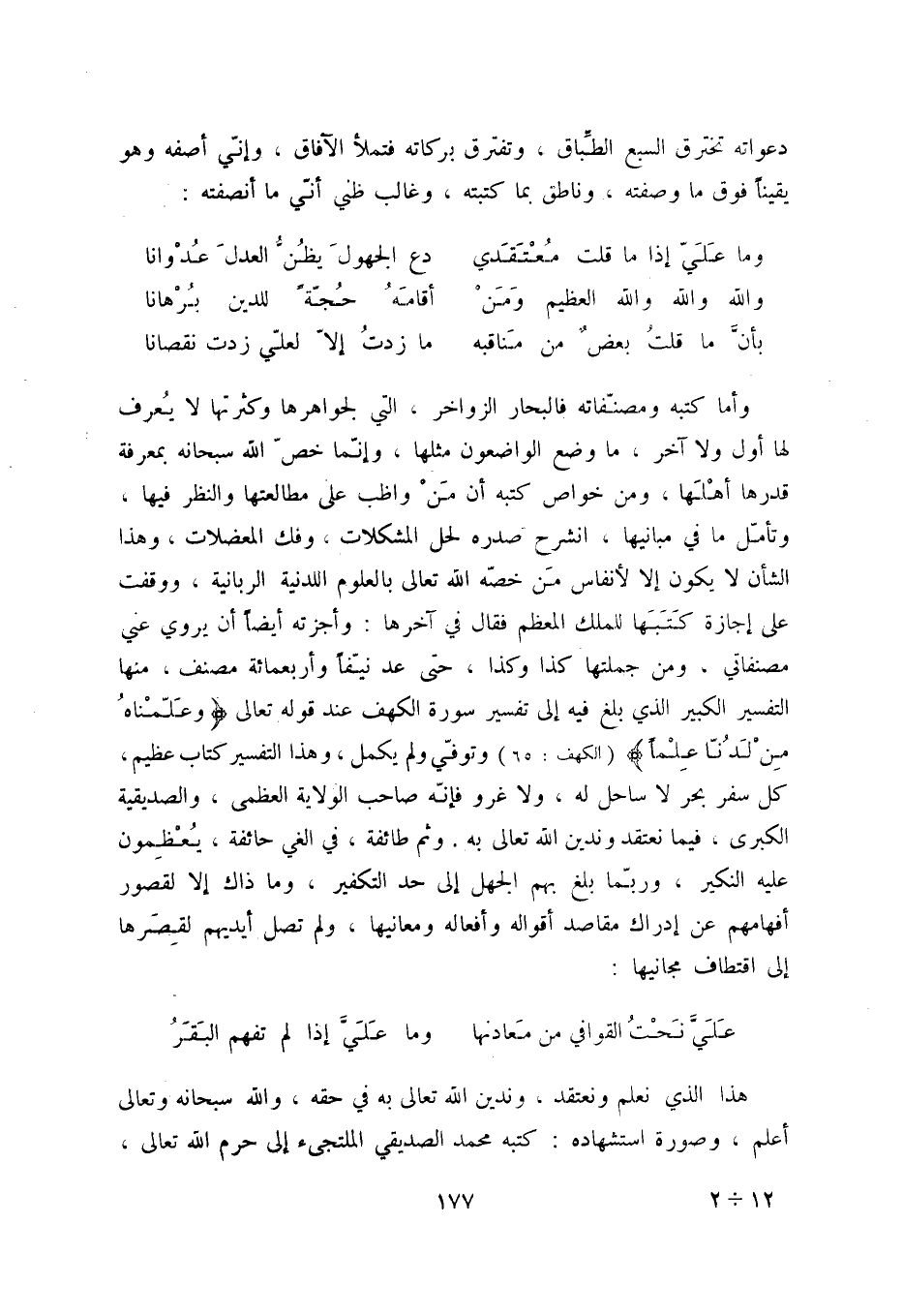 عليّ نحت القوافي من معادنها ... وما عليّ إذا لم تفهم البقر هذا الذي نعلم ونعتقد، وندين الله تعالى به في حقه، والله سبحانه وتعالى أعلم، وصورة استشهاده: كتبه محمد الصديقي الملتجئ إلى حرم الله تعالى