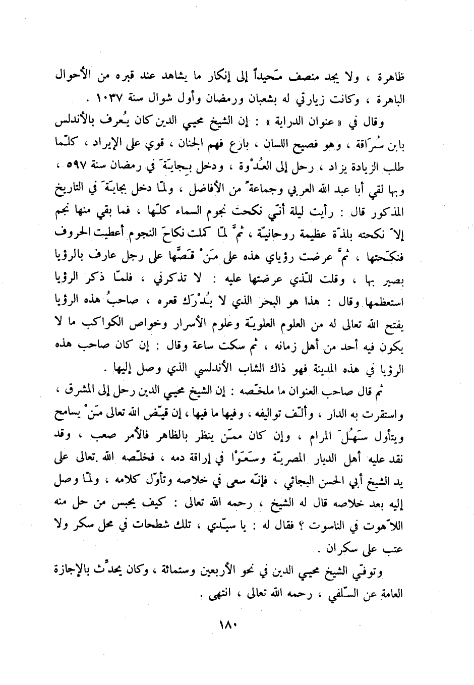 وقال في عنوان الدراية: إن الشيخ محيي الدين كان يعرف بالأندلس بابن سراقة، وهو فصيح اللسان، بارع فهم الجنان، قوي على الإيراد، كلّما طلب الزيادة يزاد، رحل إلى العدوة، ودخل بجاية في رمضان سنة 597، وبها لقي أبا عبد الله العربي وجماعةً من الأفاضل، ولمّا دخل بجاية في التاريخ المذكور قال: رأيت ليلة أنّي نكحت نجوم السماء كلّها، فما بقي منها نجم إلاّ نكحته بلذّة عظيمة روحانيةّ، ثمّ لمّا كملت نكاح النجوم أعطيت الحروف فنكّحتها، ثمّ عرضت رؤياي هذه على من قصّها على رجل عارف بالرؤيا بصير بها، وقلت للّذي عرضتها عليه: لا تذكرني، فلمّا ذكر الرؤيا استعظمها وقال: هذا هو البحر الذي لا يدرك قعره، صاحب هذه الرؤيا يفتح الله تعالى له من العلوم العلويّة وعلوم الأسرار وخواص الكواكب ما لا يكون فيه أحد من أهل زمانه، ثم سكت ساعة، وقال: إن كان صاحب هذه الرؤيا في هذه المدينة فهو ذاك الشاب الأندلسي الذي وصل إليها.