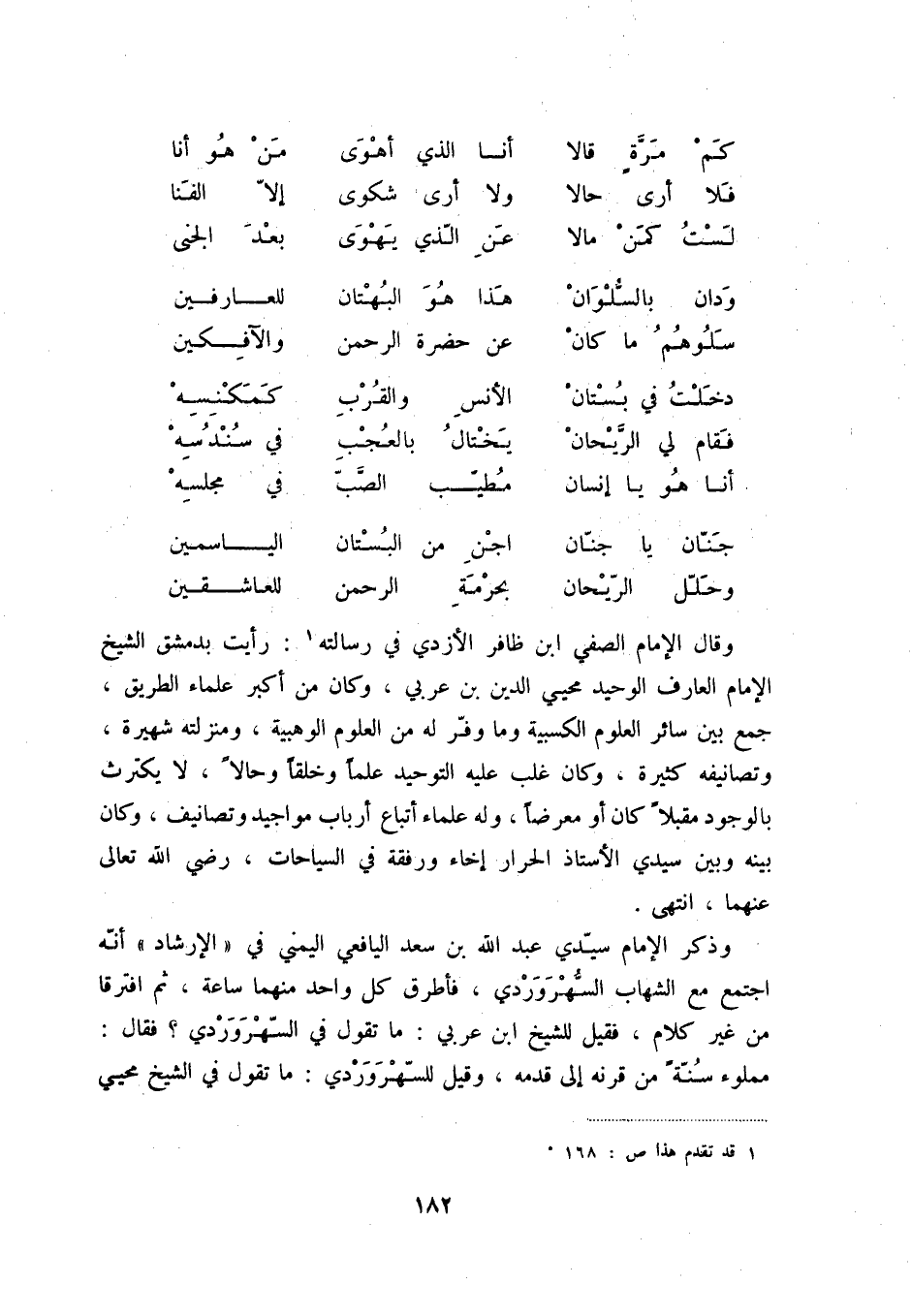 وحلّل الرّيحان ... بحرمة الرحمن للعاشقين وقال الإمام الصفي ابن ظافر الأزدي في رسالته (1) : رأيت بدمشق الشيخ الإمام العارف الوحيد محيي الدين بن عربي، وكان من أكبر علماء الطريق، جمع بين سائر العلوم الكسبية وما وفّر له من العلوم الوهبية، ومنزلته شهيرة، وتصانيفه كثيرة، وكان غلب عليه التوحيد علماً وخلقاً وحالاً، لا يكترث بالوجود مقبلاً كان أو معرضاً، وله علماء أتباع أرباب مواجيد وتصانيف، وكان بينه وبين سيدي الأستاذ الحرار إخاء ورفقة في السياحات، رضي الله تعالى عنهما، انتهى.