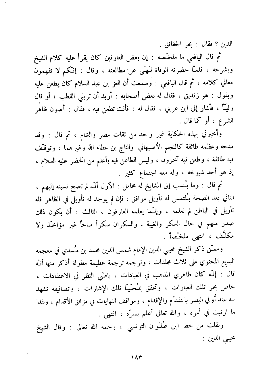 ونقلت من خط ابن علوان التونسي، رحمه الله تعالى: وقال الشيخ محيي الدين: