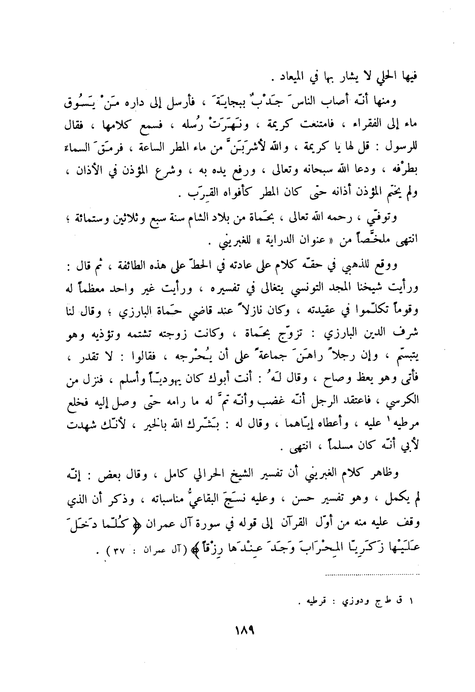 ووقع للذهبي في حقّه كلام على عادته في الحطّ على هذه الطائفة، ثم قال: ورأيت شيخنا المجد التونسي يتغالى في تفسيره، رأيت غير واحد معظماً له وقوماً تكلّموا في عقيدته، وكان نازلاً عند قاضي حماة البارزي؛ وقال لها شرف الدين البارزي: تزوّج بحماة، وكانت زوجته تشتمه وتؤذيه وهو يتبسّم، وإن رجلاً راهن جماعةً على أن يحرجه، فقالوا: لا تقدر، فأتى وهو يعظ وصاح، وقال له: أنت أبوك كان يهوديّاً وأسلم، فنزل من الكرسي، فاعتقد الرجل أنّه غضب وأنّه تمّ له ما رامه حتى وصل إليه فخلع مرطيه (1) عليه، وأعطاه إيّاهما، وقال له: بشّرك الله بالخير، لأنّك شهدت لأبي أنّه كان مسلماً، انتهى.