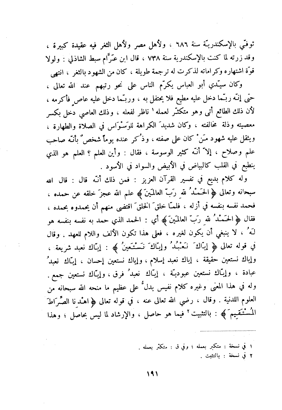 وله كلام بديع في تفسير القرآن العزيز: فمن ذلك أنّه قال: قال الله سبحانه وتعالى " الحمد لله ربّ العالمين " علم الله عجز خلقه عن حمده، فحمد نفسه بنفسه في أزله، فلمّا خلق الخلق اقتضى منهم أن يحمدوه بحمده، فقال " الحمد لله ربّ العالمين " أي: الحمد الذي حمد به نفسه بنفسه هو له، لا ينبغي أن يكون لغيره، فعلى هذا تكون الألف واللام للعهد. وقال في قوله تعالى " إيّاك نعبد وإيّاك نستعين ": إيّاك نعبد شريعة، عبادة، وإيّاك نستعين عبوديّة، إيّاك نعبد فرق، وإيّاك نستعين جمع. وله في هذا المعنى وغيره كلام نفيس يدلّ على عظيم ما منحه الله سبحانه من العلوم اللدنية. وقال، رضي الله تعالى عنه، في قوله تعالى " اهدنا الصّراط المستقيم ": بالتثبيت (2) فيما هو حاصل، والإرشاد لما ليس بحاصل؛ وهذا