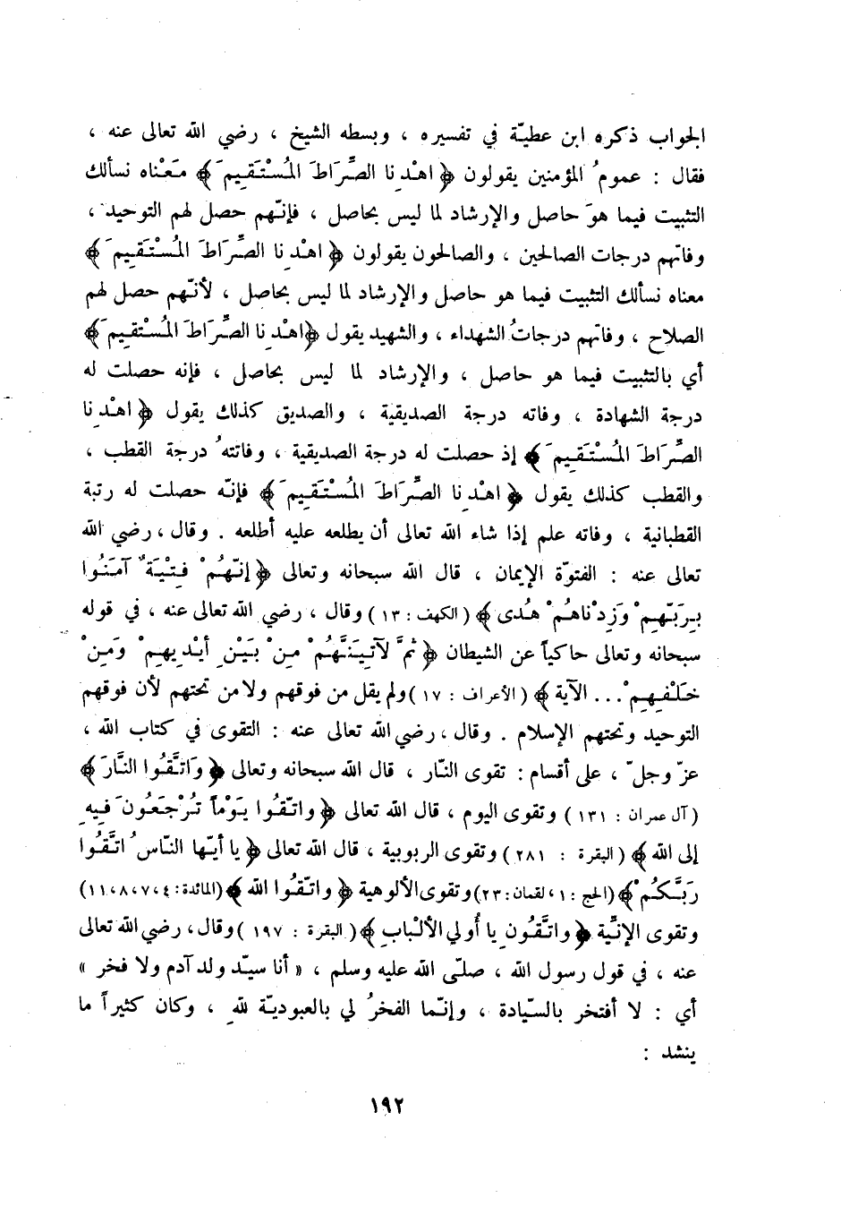 الجواب ذكره ابن عطيّة في تفسيره، وبسطه الشيخ، رضي الله تعالى عنه، فقال: عموم المؤمنين يقولون " اهدنا الصّراط المستقيم " معناه نسألك التثبيت فيما هو حاصل والإرشاد لما ليس بحاصل، فإنّهم حصل لهم التوحيد، وفاتهم درجات الصالحين، والصالحون يقولون " اهدنا الصّراط المستقيم " معناه نسألك التثبيت فيما هو حاصل والإرشاد لما ليس بحاصل، لأنّهم حصل لهم الصلاح، وفاتهم درجات الشهداء، والشهيد يقول " اهدنا الصّراط المستقيم " درجة الشهادة، وفاته درجة الصديقية، والصديق كذلك يقول " اهدنا الصّراط المستقيم " إذ حصلت له درجة الصديقية، وفاتته درجة القطب، والقطب كذلك يقول " اهدنا الصّراط المستقيم " فإنّه حصلت له رتبة القطبانية، وفاته علم إذا شاء الله تعالى أن يطلعه عليه أطلعه. وقال، رضي الله تعالى عنه: الفتوّة الإيمان، قال الله سبحانه وتعالى " إنّهم فتيةٌ آمنوا بربّهم وزدناهم هدى " وقال، رضي الله تعالى عنه، في قوله سبحانه وتعالى حاكياً عن الشيطان " ثمّ لآتينّهم من بين أيديهم ومن خلفهم ... الأية " ولم يقل من فوقهم ولا من تحتهم لأن فوقهم التوحيد وتحتهم الإسلام. وقال، رضي الله تعالى عنه: التقوى في كتاب الله، عزّ وجلّ، على أقسام: تقوى النّار، قال الله سبحانه وتعالى " واتّقوا النّار " وتقوى اليوم، قال الله تعالى " واتّقوا يوماً ترجعون فيه إلى الله، وتقوى الربوبية، قال الله تعالى " يا أيّها النّاس اتّقوا ربّكم " وتقوى الألوهية " واتّقوا الله " وتقوى الإنّية " واتّقوى يا أولي الألباب " وقال، رضي الله تعالى عنه، في قول رسول الله، صلّى الله عليه وسلم، " أنا سيّد ولد آدم ولا فخر " أي: لا أفتخر بالسّيادة، وإنّما الفخر لي بالعبودية لله، وكان كثيراً ما ينشد: