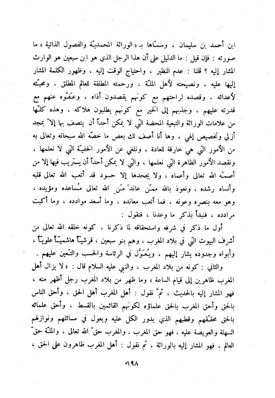 ابن أحمد بن سليمان، سمّاها بالوراثة المحمديّة والفصول الذاتية ما صورته: فإن قيل: ما الدليل على أن هذا الرجل الذي هو ابن سبعين هو الوارث المشار إليه قلنا: عدم النظير، واحتياج الوقت إليه، وظهرو الكلمة المشار إليها عليه، ونصيحته لأهل الملّة، ورحمته المطلقة للعالم المطلق، ومحبّته لأعدائه، وقصده لراحتهم مع كونهم يقصدون أذاه، وعفوه عنهم مع قدرته عليهم، وجذبهم إلى الخير مع كونهم يطلبون هلاكه، وهذه كلّها من علامات الوراثة والتبعية المحضة التي لا يمكن أحداً أن يتصف بها إلاّ بمجد أزلي وتخصيص إلهي، وها أنا أصف لك بعض ما خصّه الله سبحانه وتعالى به من الأمور التي هي خارقة للعادة، ونلغي عن الأمور الخفيّة التي لا نعلمها، ونقصد الأمور الظاهرة التي نعلمها، والتي لا يمكن أحداً أن يستريب فيها إلاّ من أصمّه الله تعالى وأعماه، ولا يجحدها إلا حسود قد أتعب الله تعالى قلبه وأنساه رشده، ونعوذ بالله ممّن عاند من الله تعالى مساعده ومؤيده، وهو معه بنصره وعونه، فما أتعب معانده، وما أسعد موادده، وما أكبت مرادده، فنبدأ بذكر ما وعدنا، فنقول: