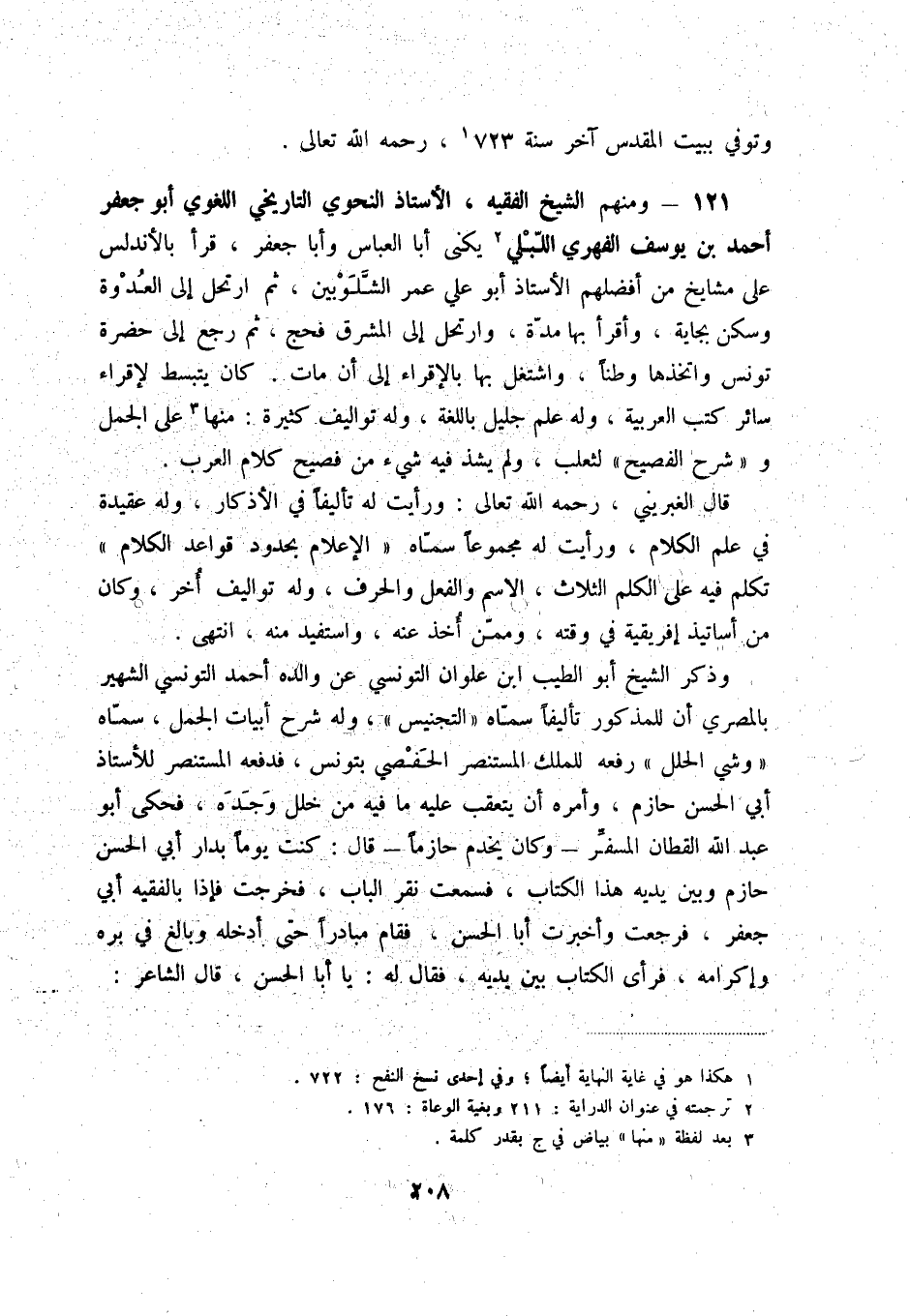 121 - ومنهم الشيخ الفقيه، الأستاذ النحوي التاريخي اللغوي أبو جعفر أحمد بن يوسف الفهري اللّبلي (2) يكنى أبا العباس وأبا جعفر، قرأ بالأندلس على مشايخ من أفضلهم الأستاذ أبو علي عمر الشّلوبين، ثم ارتحل إلى العدوة وسكن بجاية، وأقرأ بها مدّة، وارتحل إلى المشرق فحج، ثم رجع إلى حضرة تونس واتخذها وطناً، واشتغل بها بالإقراء إلى أن مات. كان يتبسط لإقراء سائر كتب العربية، وله علم جليل باللغة، وله تواليف كثيرة: منها (3) على الجمل وشرح الفصيح لثعلب، ولم يشذ فيه شيء من فصيح كلام العرب.