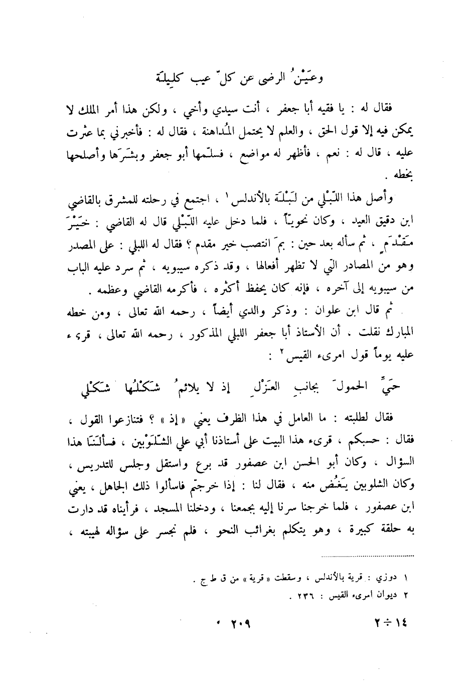 ثم قال ابن علوان: وذكر والدي أيضاً، رحمه الله تعالى، ومن خطه المبارك نقلت، أن الأستاذ أبا جعفر اللبلي المذكور، رحمه الله تعالى، قرئ عليه يوماً قول امرئ القيس (2) :
