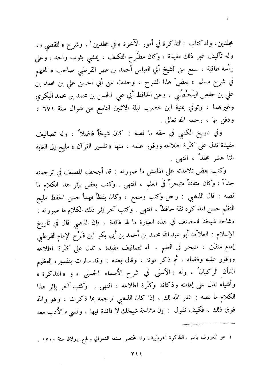 (1) هو المعروف " التذكرة القرطبية " وله مختصر صنعه الشعراني وطبع ببولاق سنة 1300.