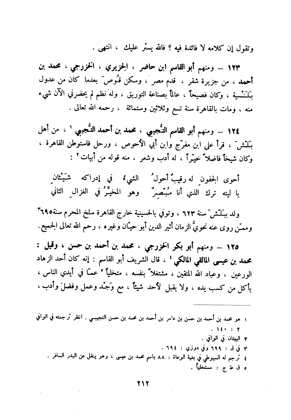 124 - ومنهم أبو القاسم التّجيبي، محمد بن أحمد التّجيبي (1) ، من أهل بلّش، قرأ على ابن مفرّج وابن أبي الأحوص، ورحل فاستوطن القاهرة وكان شيخاً فاضلاً خيّراً، له أدب وشعر، منه قوله من أبيات (2) :
