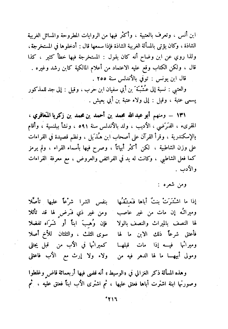 131 - ومنهم أبو عبد الله محمد بن أحمد بن محمد بن زكريا المعافري، المقرئ، الفرضي، الأديب، ولد بالأندلس سنة 591، ونشأ ببلنسية، وأقام بالإسكندرية، وقرأ القرآن على أصحاب ابن هذيل، ونظم قصيدة في القراءات على وزن الشاطبية، لكن أكثر أبياتاً، وصرح فيها بأسماء القراء، ولم يرمز كما فعل الشاطبي، وكانت له يد في الفرائض والعروض، مع معرفة القراءات والأدب.