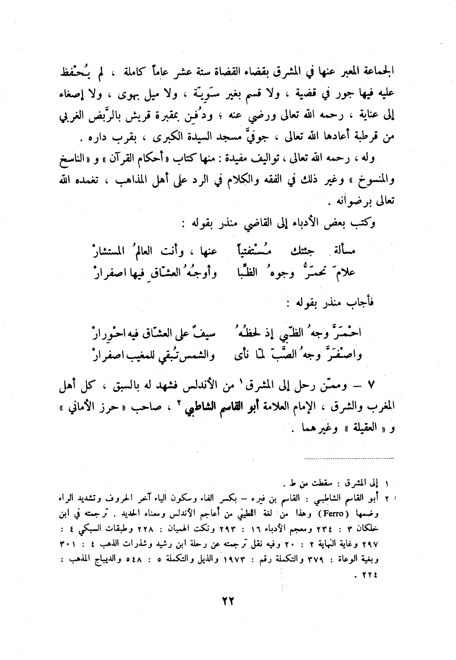 واصفرّ وجع الصّبّ لمّا نأى ... والشمس تبقي للمغيب اصفرار 7 - وممّن رحل إلى المشرق (1) من الأندلس فشهد له بالسبق، كل أهل المغرب والشرق، والإمام العلامة أبو القاسم الشاطبي (2) ، صاحب " حرز الأماني " و " العقيلة "، وغيرهما.