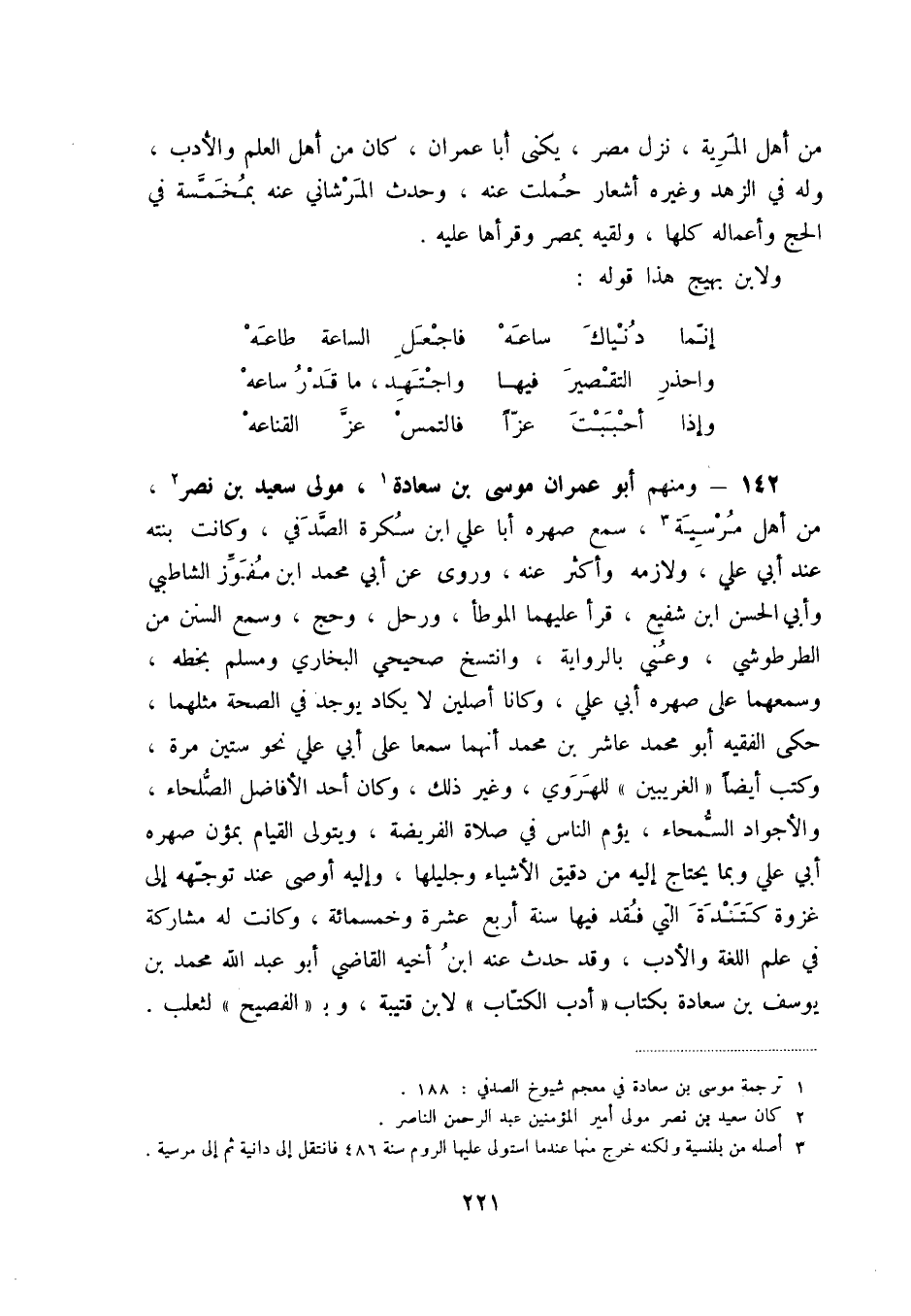 وإذا أحببت عزّاً ... فالتمس عزّ القناعه 142 - ومنهم أبو عمران موسى بن سعادة (1) ، مولى سعيد بن نصر (2) ، من أهل مرسية (3) ، سمع صهره أبا علي ابن سكرة الصّدفي، وكانت بنته عند أبي علي، ولازمه وأكثر عنه، وروى عن أبي محمد ابن مفوّز الشاطبي وأبي الحسن ابن شفيع، قرأ عليهما الموطأ، ورحل، وحج، وسمع السنن من الطرطوشي، وعني بالرواية، وانتسخ صحيحي البخاري ومسلم بخطه، وسمعهما على صهره أبي علي، وكانا أصلين لا يكاد يوجد في الصحة مثلهما، حكى الفقيه أبو محمد عاشر بن محمد أنهما سمعا على أبي علي نحو ستين مرة، وكتب أيضاً الغريبين للهروي، وغير ذلك، وكان أحد الأفاضل الصّلحاء، والأجواد السّمحاء، يؤم الناس في صلاة الفريضة، وتولى القيام بمؤن صهره أبي علي وبما يحتاج إليه من دقيق الأشياء وجليلها، وإليه أوصى عند توجّهه إلى غزوة كتندة التي فقد فيها سنة أربع عشرة وخمسمائة، وكانت له مشاركة في علم اللغة والأدب، وقد حدث عنه ابن أخيه القاضي أبو عبد الله محمد بن يوسف بن سعادة بكتاب أدب الكتّاب لابن قتيبة، وبالفصيح لثعلب.