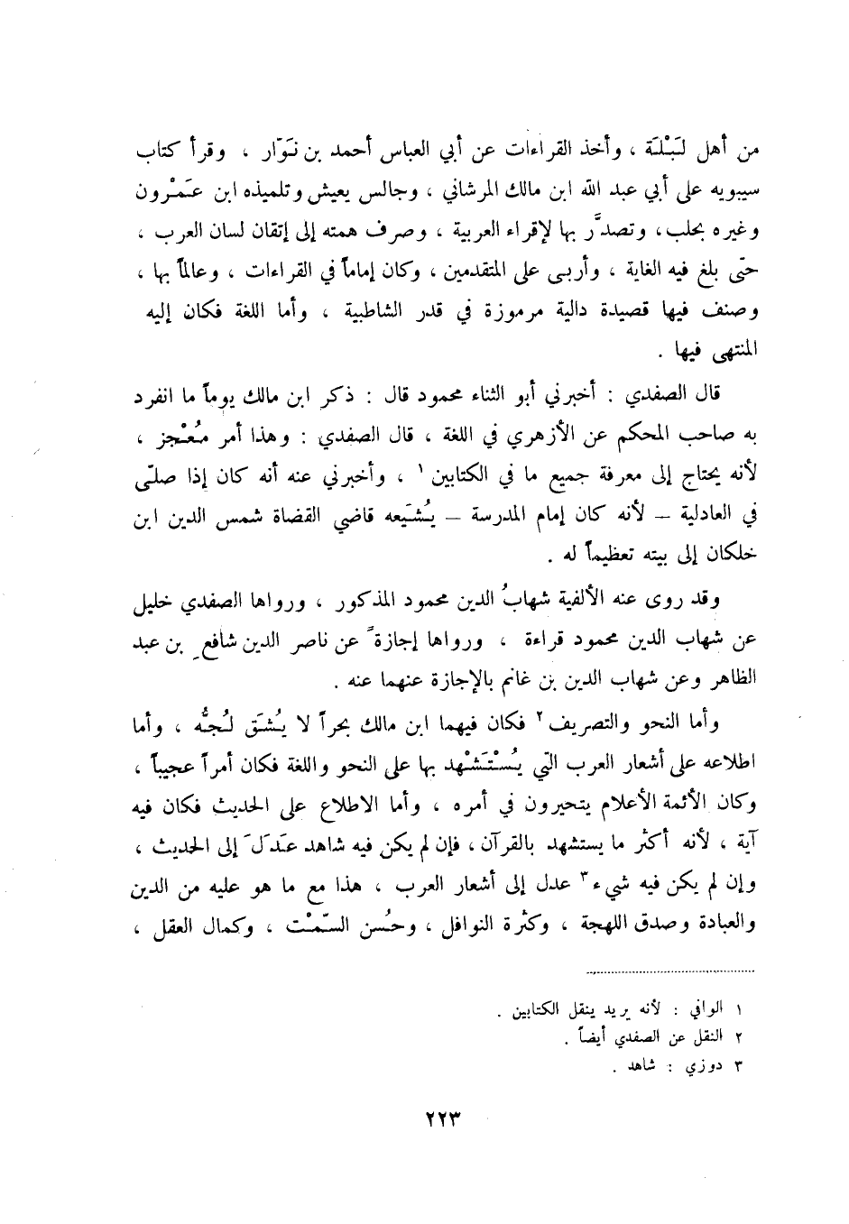 قال الصفدي: أخبرني أبو الثناء محمود قال: ذكر ابن مالك يوماً ما انفرد به صاحب المحكم عن الأزهري في اللغة، قال الصفدي: وهذا أمر معجز، لأنه يحتاج إلى معرفة جميع ما في الكتابين (1) ، وأخبرني عنه أنه كان إذا صلّى في العادلية - لأنه كان إمام المدرسة - يشيعه قاضي القضاة شمس الدين ابن خلكان إلى بيته تعظيماً له.