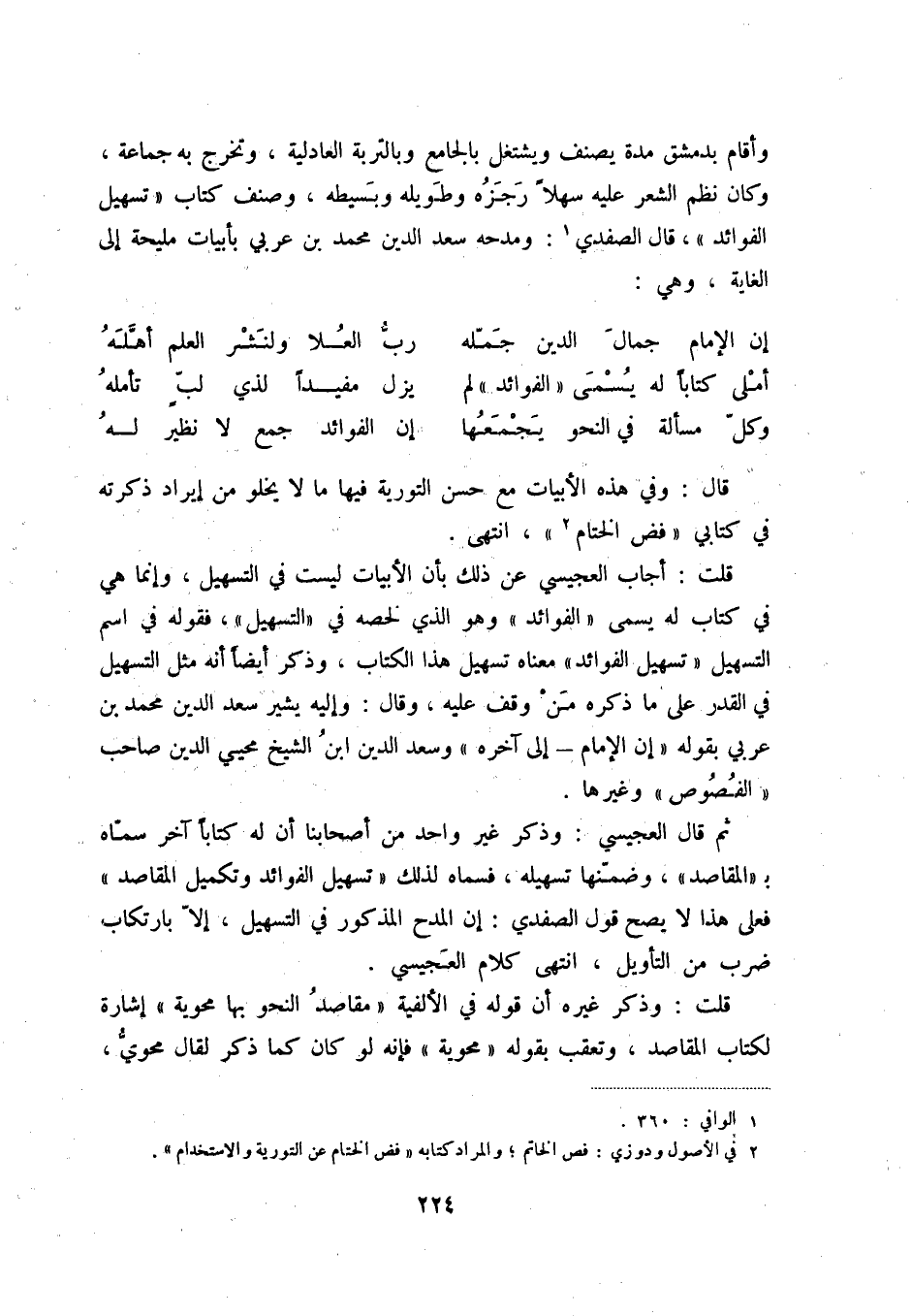 ثم قال العجيسي: وذكر غير واحد من أصحابنا أن له كتاباً آخر سمّاه بالمقاصد، وضمّنها تسهيله، فسماه لذلك تسهيل الفوائد وتكميل المقاصد فعلى هذا لا يصح قول الصفدي: إن المدح المذكور في التسهيل، إلاّ بارتكاب ضرب من التأويل، انتهى كلام العجيسي.