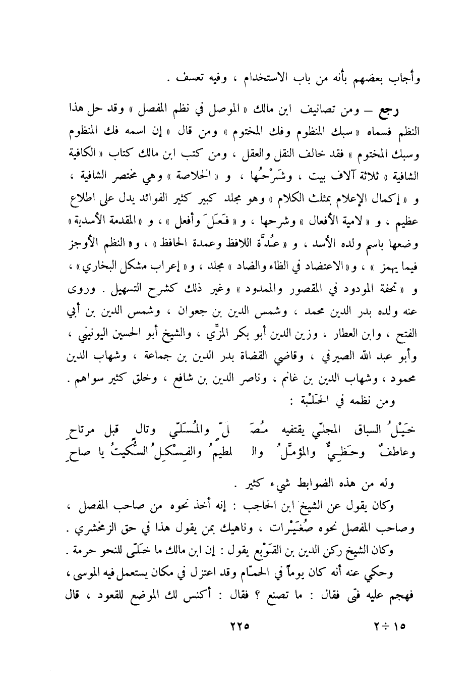 رجع - من تصانيف ابن مالك " الموصل في نظم المفصل " وقد حل هذا النظم فسماه " سبك المنظوم وفك المختوم " ومن قال " إن اسمه فك المنظوم وسبك المختوم " فقد خالف النقل والعقل، ومن كتب ابن مالك كتاب " الكافية الشافية " ثلاثة آلاف بيت، وشرحها، و " الخلاصة " وهي مختصر الشافية، و " إكمال الإعلام بمثلث الكلام " وهو مجلد كبير كثير الفوائد يدل على اطلاع عظيم، و " لامية الأفعال " وشرحها، و " فعل وأفعل "، و " المقدمة الأسدية " وضعها باسم ولده الأسد، و " عدّة اللافظ وعمدة الحافظ "، و " النظم الأوجز فيما يهمز "، و " الاعتضاد في الظاء والضاد " مجلد، وإعراب مشكل البخاري، و " تحفة المودود في المقصور والممدود " وغير ذلك كشرح التسهيل، وروى عنه ولده بدر الدين محمد، وشمس الدين بن جعوان، وشمس الدين بن أبي الفتح، وابن العطار، وزين الدين أبو بكر المزّي، والشيخ أبو الحسين اليونيني، وأبو عبد الله الصيرفي، وقاضي القضاة بدر الدين بن جماعة، وشهاب الدين محمود، وشهاب الدين بن غانم، وناصر الدين بن شافع، وخلق كثير سواهم.
