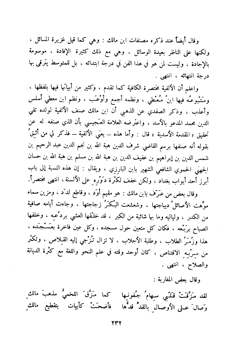 قال أيضاً عند ذكره مصنفات ابن مالك: وهي كما قيل غزيرة المسائل، ولكنها على الناظر بعيدة الوسائل، وهي مع ذلك كثيرة الإفادة، موسومة بالإجادة، وليست لمن هو في هذا الفن في درجة ابتدائه، بل للمتوسط يترقى بها درجة انتهائه، انتهى.