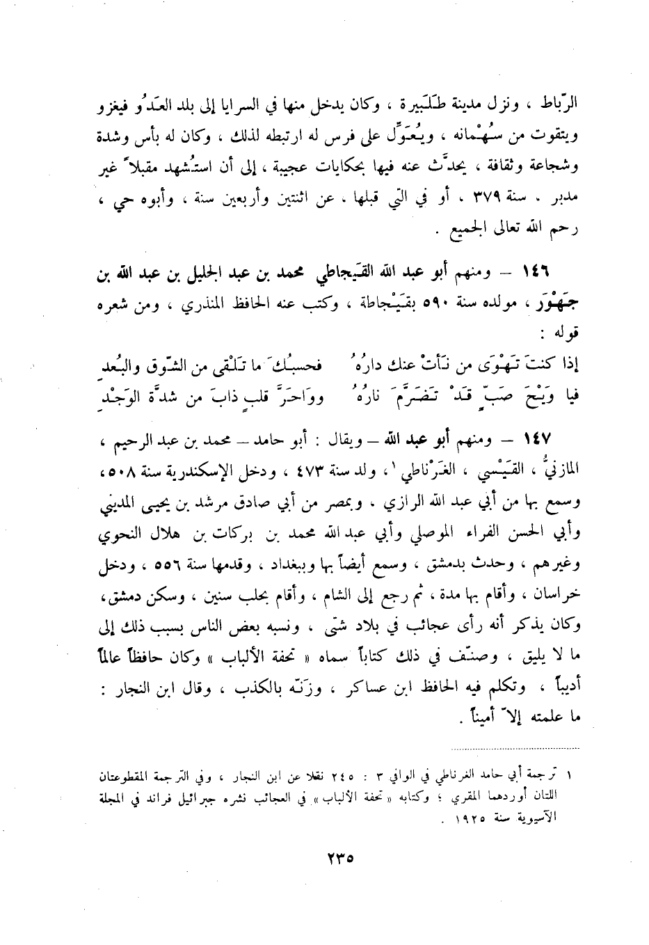 (1) ترجمة أبي حامد الغرناطي في الوافي 3: 245 نقلاً عن ابن النجار، وفي الترجمة المقطوعتان اللتان أوردها المقري؛ وكتابه " تحفة الألباب " في العجائب نشره جبرائيل فراند في المجلة الآسيوية سنة 1925.