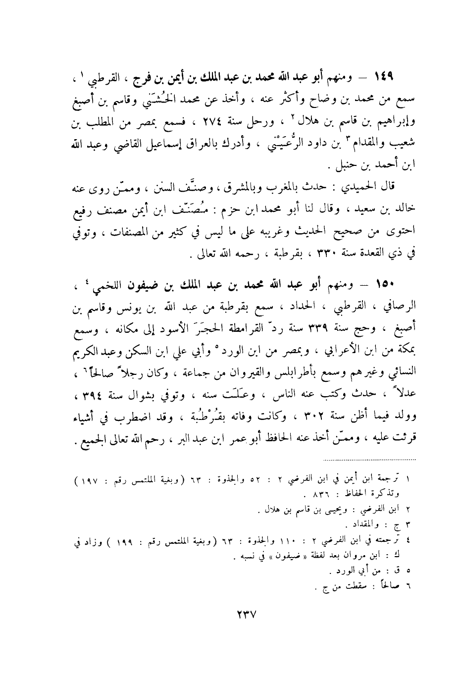 (4) ترجمته في ان الفرضي 2: 110 والجذوة: 63 (وبغية الملتمس رقم: 199) وزاد في ك: ابن مروان بعد لفظة " ضيفون " في نسبه.