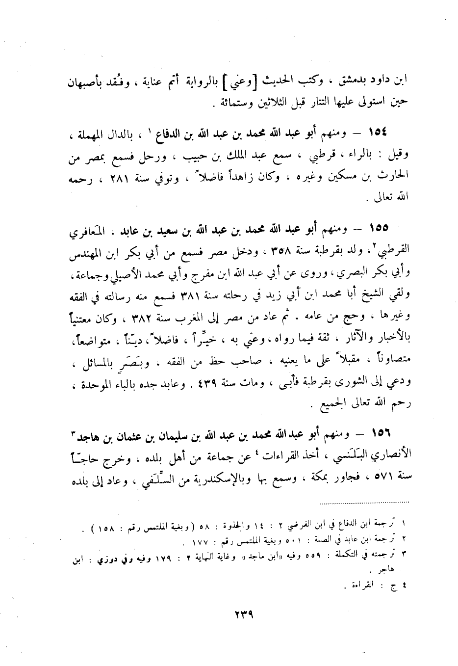 155 - ومنهم أبو عبد الله محمد بن عبد الله بن سعيد بن عابد، المعافري القرطبي (2) ، ولد بقرطبة سنة 358، ودخل مصر فسمع من أبي بكر ابن المهندس وأبي بكر البصري، وروى عن أبي عبد الله ابن مفرج وأبي محمد الأصيلي وجماعة، ولقي الشيخ أبا محمد ابن أبي زيد في رحلته سنة 381 فسمع منه رسالته في الفقه وغيرها، وحج من عامه، ثم عاد من مصر إلى المغرب سنة 382، وكان معتنياً بالأخبار والآثار، ثقة فيما رواه، وعني به، خيّراً، فاضلاً، ديّناً، متواضعاً، متصاوناً، مقبلاً على ما يعنيه، صاحب حظ من الفقه، وبصر بالمسائل، ودعي إلى الشورى بقرطبة فأبى، ومات سنة 439. وعابد جده بالباء الوحدة، رحم الله تعالى الجميع.