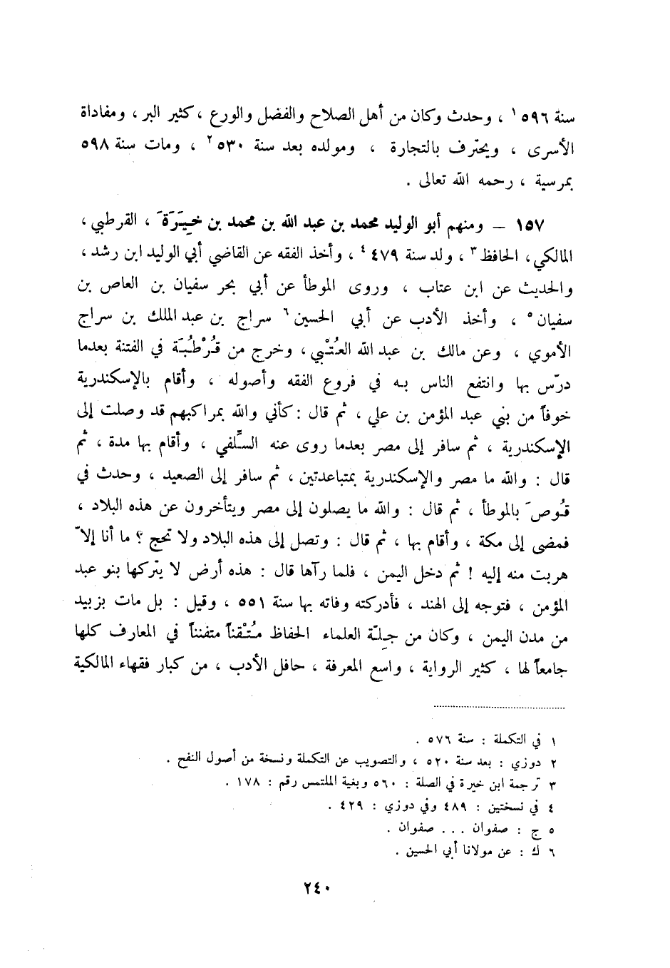 157 - ومنهم أبو الوليد محمد بن عبد الله ابن محمد بن خيرة القرطبي، المالكي (3) ، الحافظ، ولد سنة 479 (4) ، وأخذ الفقه عن القاضي أبي الوليد ابن رشد، والحديث عن ابن عتاب، وروى الموطأ عن أبي بحر سفيان بن العاص بن سفيان (5) ، وأخذ الأدب عن أبي الحسين (6) سراج بن عبد الملك بن سراج الأموي، وعن مالك بن عبد الله العتبي، وخرج من قرطبة في الفتنة بعدا درّس بها وانتفع الناس به في فروع الفقه وأصوله، وأقام بالإسكندرية خوفاً من بني عبد المؤمن بن علي، ثم قال: كأني والله بمراكبهم قد وصلت إلى الإسكندرية، ثم سافر إلى المصر بعدما روى عنه السّلفي، وأقام بها مدة، ثم قال: والله ما مصر والإسكندرية بمتباعدتين، ثم سافر إلى الصعيد، وحدث في قوص بالموطأ، ثم قال: والله يصلون إلى مصر ويتأخرون عن هذه البلاد، فمضى إلى مكة، وأقام بها، ثم قال: وتصل إلى هذه البلاد ولا تحج ما أنا إلاّ هربت منه إليه ثم دخل اليمن، فلما رآها قال: هذه أرض لا يتركها بنو عبد المؤمن، فتوجه إلى الهند، فأدركته وفاه بها سنة 551، وقيل: بل مات بزبيد من مدن اليمن، وكان من جلّة العلماء متقناً متفنناً في المعارف كلها جامعاً لها، كثير الرواية، واسع المعرفة، حافل الأدب، من كبار فقهاء المالكية