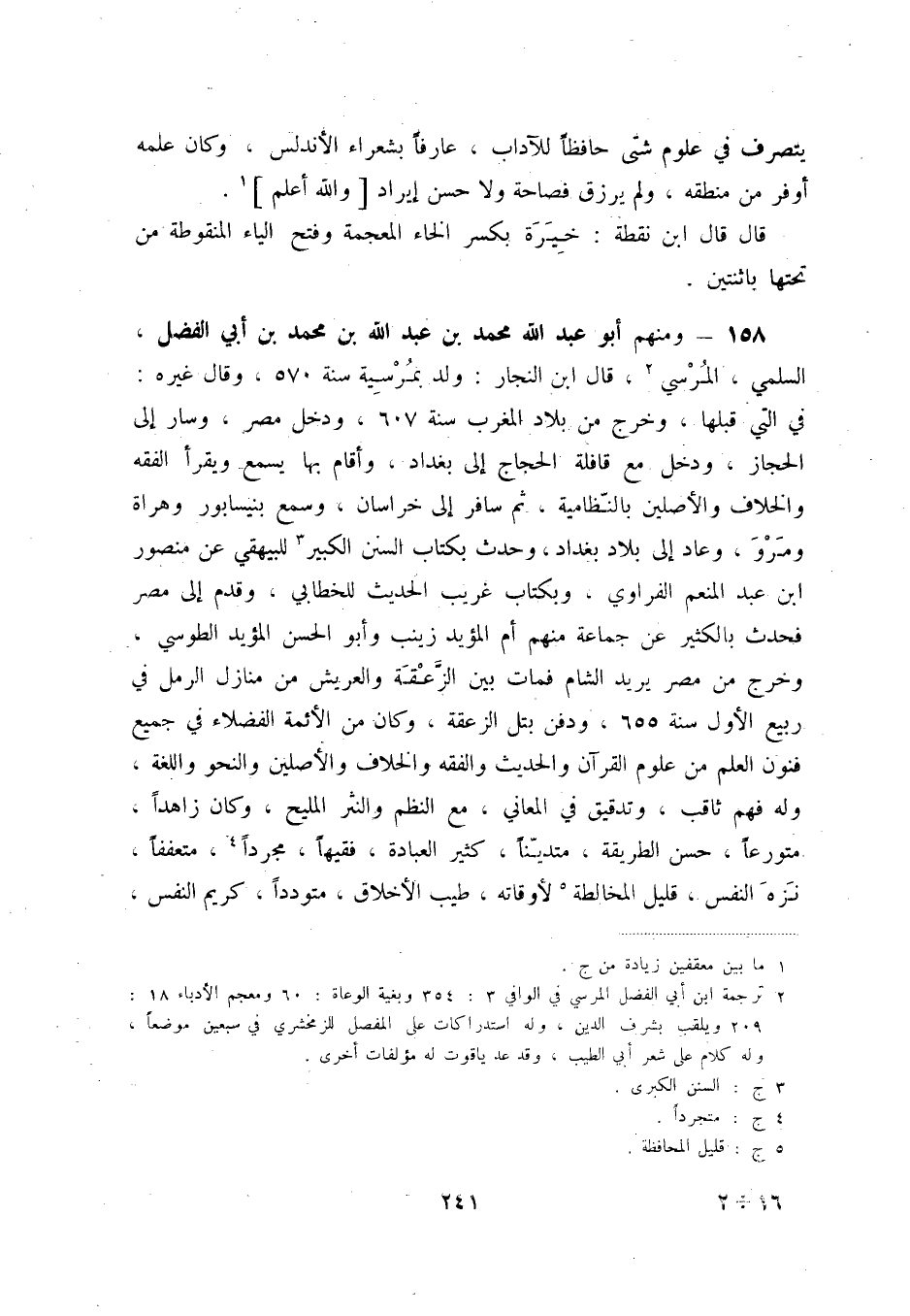 158 - ومنهم أبو عبد الله محمد بن عبد الله بن محمد بن أبي الفضل، السلمي، المرسي (2) ، قال ابن النجار: ولد بمرسية سنة 570، وقال غيره: في التي قبلها، وخرج من بلاد المغرب سنة 607، ودخل مصر، وسار إلى الحجاز، ودخل مع قافلة الحجاج إلى بغداد، وأقام بها يسمع ويقرأ الفقه والخلاف والأصلين بالنّظامية، ثم سافر إلى خراسان، وسمع بنيسابور وهراة ومرو، وعاد إلى بلاد بغداد، وحدث بكتاب السنن الكبير (3) للبيهقي عن منصور ابن عبد المنعم الفراوي، وبكتاب غريب الحديث للخطابي، وقدم إلى مصر فحدث بالكثير عن جماعة منهم أم المؤيد زينب وأبو الحسن المؤيد الطوسي، وخرج من مصر يريد الشام فمات بين الزّعقة والعريش من منازل الرمل في ربيع الأول سنة 655، ودفن بتل الزعقة، وكان من الأئمة الفضلاء في جميع فنون العلم من علوم القرآن والحديث والفقه والخلاف والأصلين والنحو واللغة، وله فهم ثاقب، وتدقيق في المعاني، مع النظم والنثر المليح، وكان زاهداً، متورعاً، حسن الطريقة، متديّناً، كثير العبادة، فقيهاً، مجرداً (4) ، متعففاً، نزه النفس، قليل المخالطة (5) لأوقاته، طيب الأخلاق، متودداً، كريم النفس،