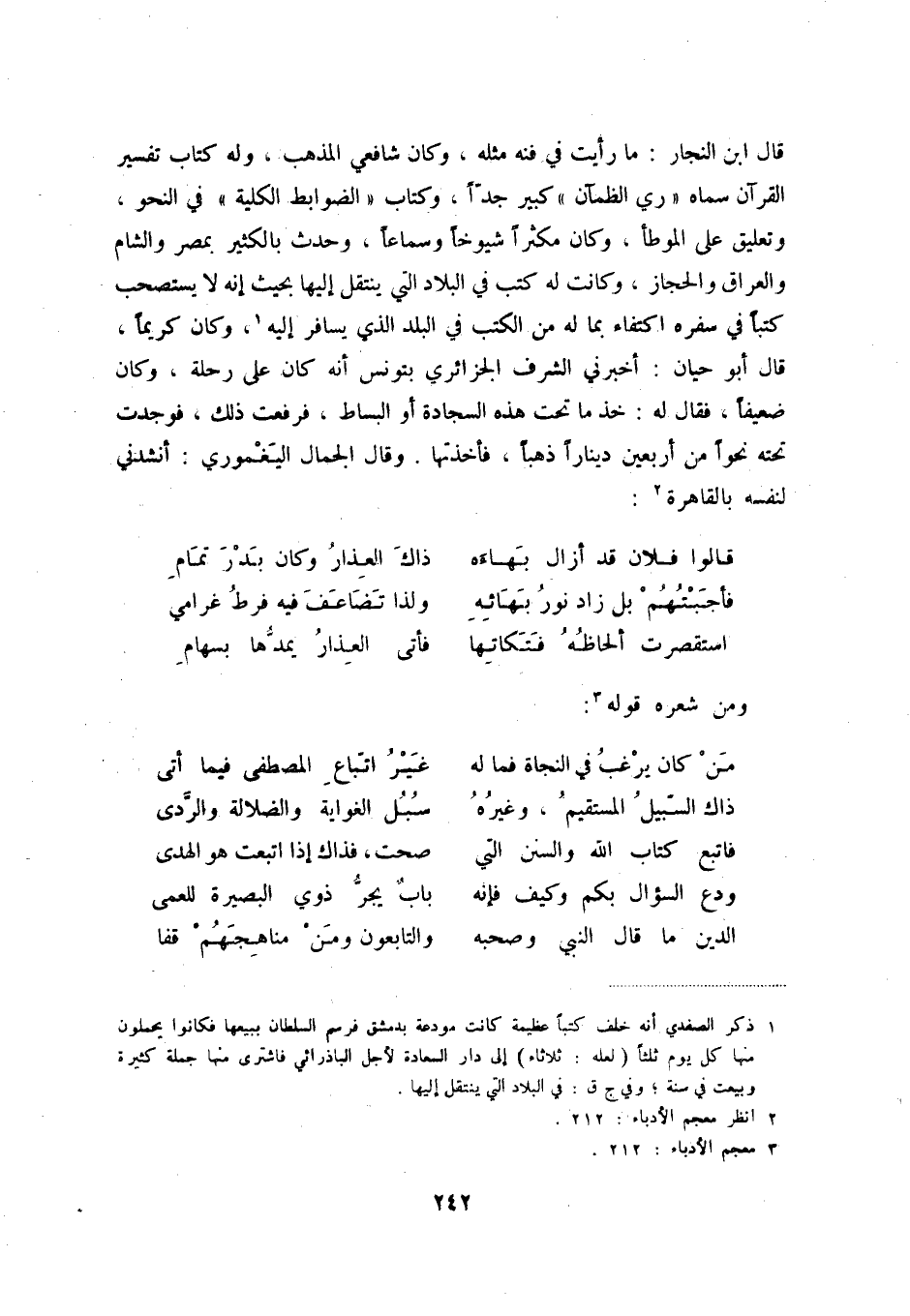 (1) ذكر الصفدي أنه خلف كتباً عظيمة كانت مودعة بدمشق فرسم السلطان ببيعها فكانوا يحملون منها كل يوم ثلثاً (لعله: ثلاثاء) إلى دار السعادة لأجل الباذرائي فاشترى منها جملة كثيرة وبيعت في سنة؛ وفي ج ق: في البلاد التي ينتقل إليها.
