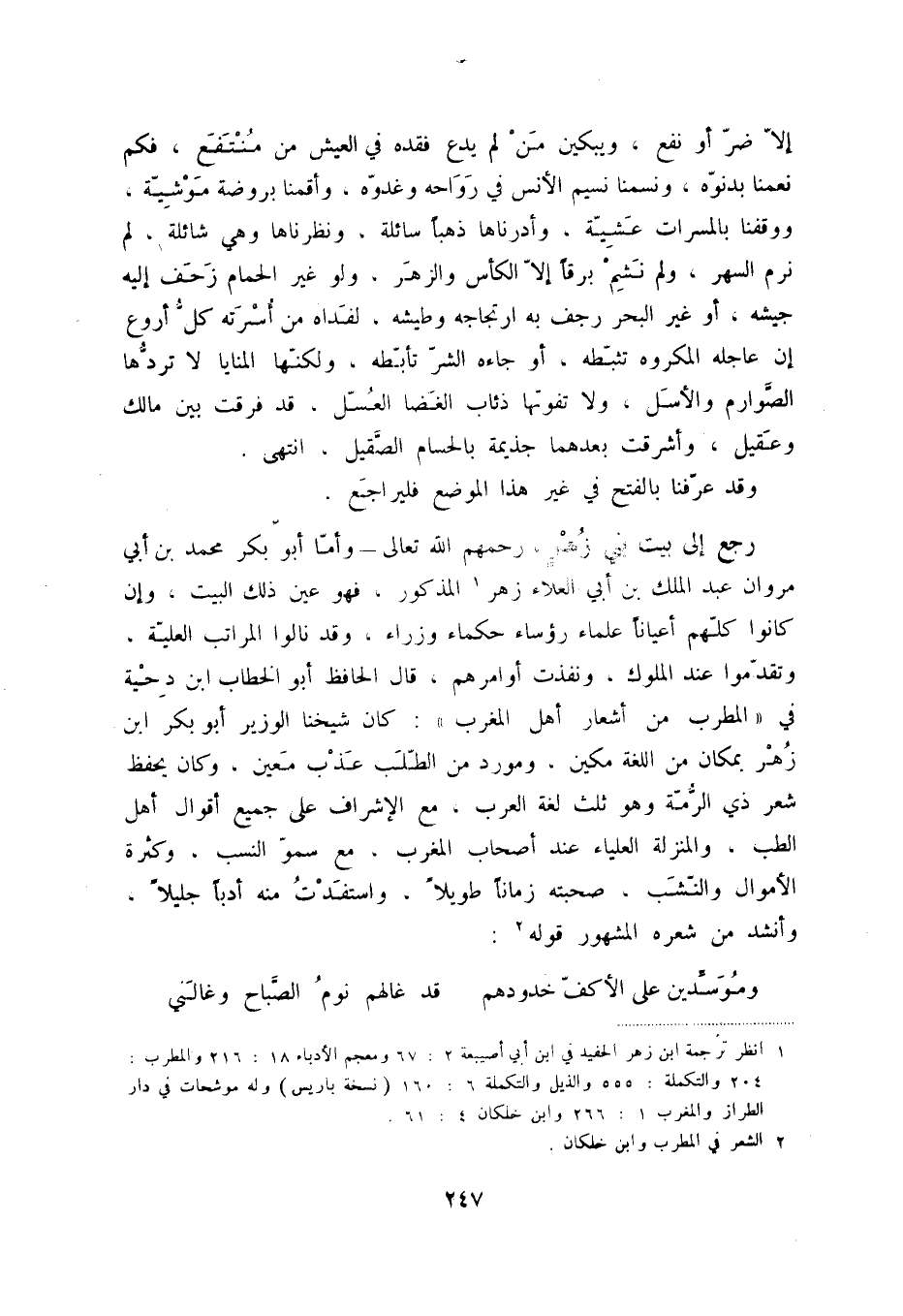رجع إلى بيت بني زهرٍ (1) ، رحمهم الله تعالى - وأمّا أبو بكر محمد بن أبي مروان عبد الملك بن أبي العلاء زهر المذكور، فهو عين ذلك البيت، وإن كانوا كلّهم أعياناً علماء رؤساء حكماء وزراء، وقد نالوا المراتب العليّة، وتقدّموا عند الملوك، ونفذت أوامرهم، قال الحافظ أبو الخطاب ابن دحية في المطرب من أشعار أهل المغرب: كان شيخنا الوزير أبو بكر ابن زهر بمكان من اللغة مكين، ومورد من الطّلب عذب معين، وكان يحفظ شعر ذي الرّمّة وهو ثلث لغة العرب، مع الإشراف على جميع أقوال أهل الطب، والمنزلة العلياء عند أصحاب المغرب، مع سموّ النسب، وكثرة الأموال والنّشب، صحبته زماناً طويلاً، واستفدت منه أدباً جليلاً، وأنشد من شعره المشهور قوله (2) :