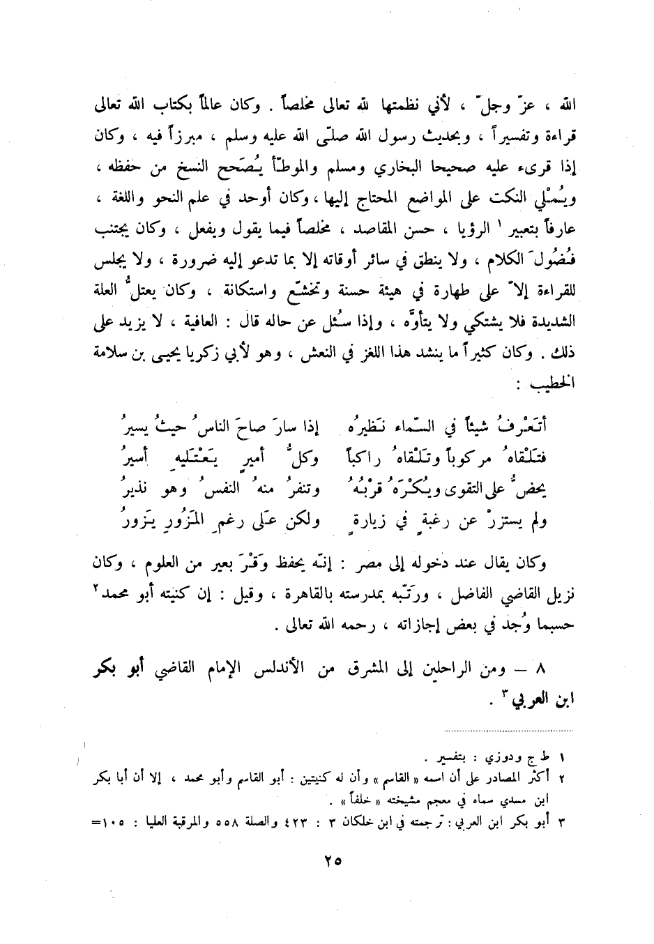 (3) أبو بكر ابن العربي: ترجمته في ابن خلكان 3: 423 والصلة 558 والمرقبة العليا: 105 والديباج المذهب: 281 وتذكرة الحفاظ: 1294 وشذرات الذهب 4: 141 (وفيات: 546) والمطمح: 62 وأزهار الرياض 3: 62، 86 - 95 وبغية الملتمس رقم: 179 والمغرب 1: 249.