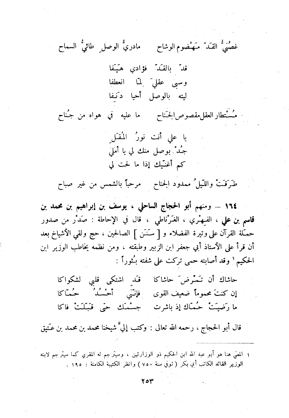 طرقت واللّيل ممدود الجناح ... مرحباً بالشمس من غير صباح 164 - ومنهم أبو الحجاج الساحلي، يوسف بن إبراهيم بن محمد بن قاسم بن علي، الفهري، الغرناطي، قال في الإحاطة: صدر من صدور حملة القرآن على وتيرة الفضلاء و [سنن] الصالحين، حج ولقي الأشياخ بعد أن قرأ على الأستاذ أبي جعفر ابن الزبير وطبقته، ومن نظمه يخاطب الوزير ابن الحكيم (1) وقد أصابته حمى تركت على شفته بثوراً: