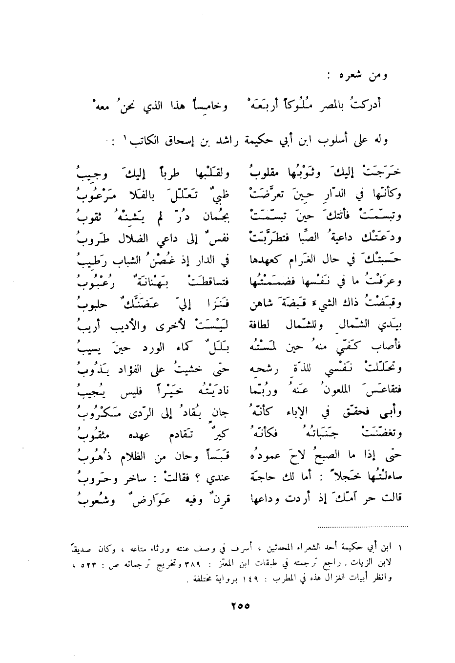 (1) ابن أبي حكيمة أحد الشعراء المحدثين، أسرف في وصف عنته ورثاء متاعه، وكان صديقاً لابن الزيات. راجع تجمته في طبقات ابن المعتز: 389 وتخريج ترجماته ص: 523، وانظر أبيات الغزال هذه في المطرب: 149 برواية مختلفة.