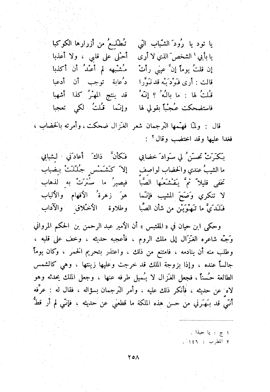 فاستضحكت عجباً بقولي لها ... وإنّما قلت لكي تعجبا قال: ولمّا فهّمها الترجمان شعر الغزال ضحكت، وأمرته بالخضاب، فغدا عليها وقد اختضب وقال (2) :
